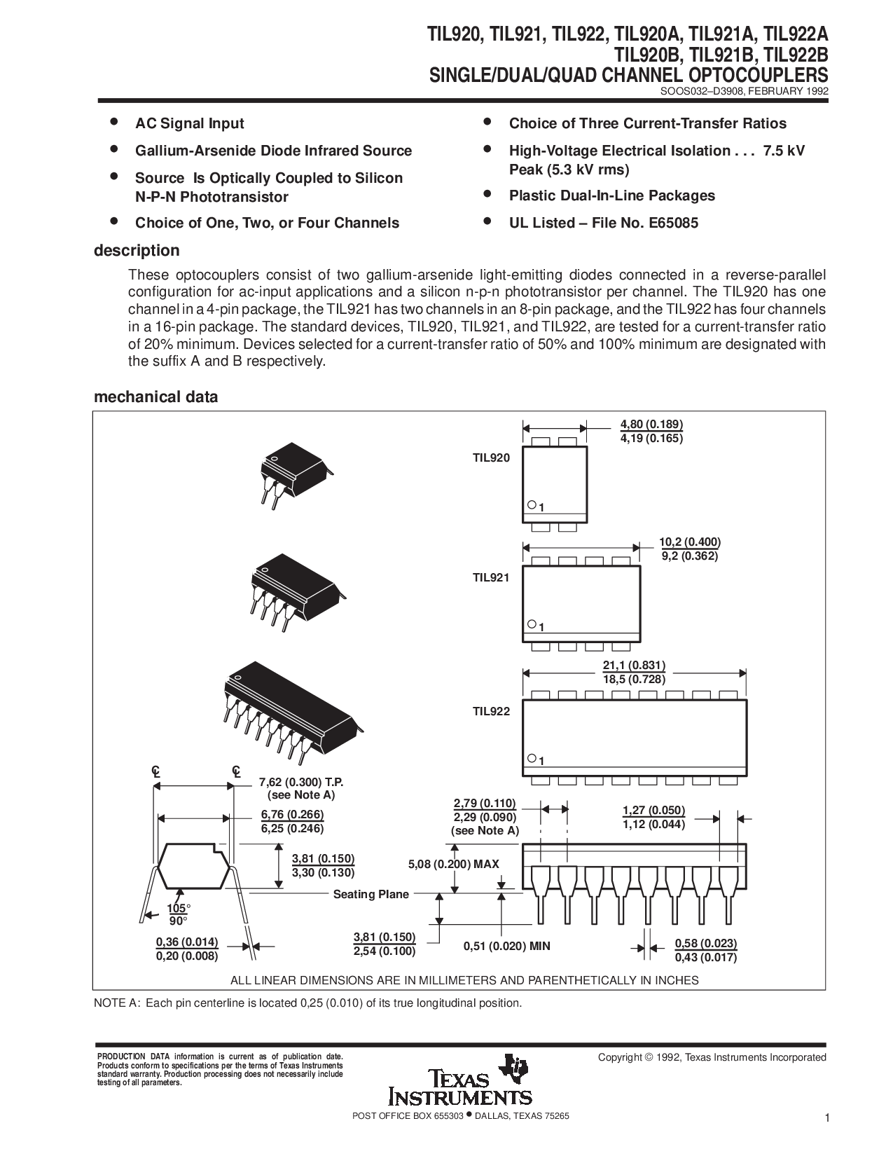 入点 一个 16-管脚 包装. 这 标准 设备, til920, til921, 和 til922, 是 已测试 用于 一个 current-transfer 比率