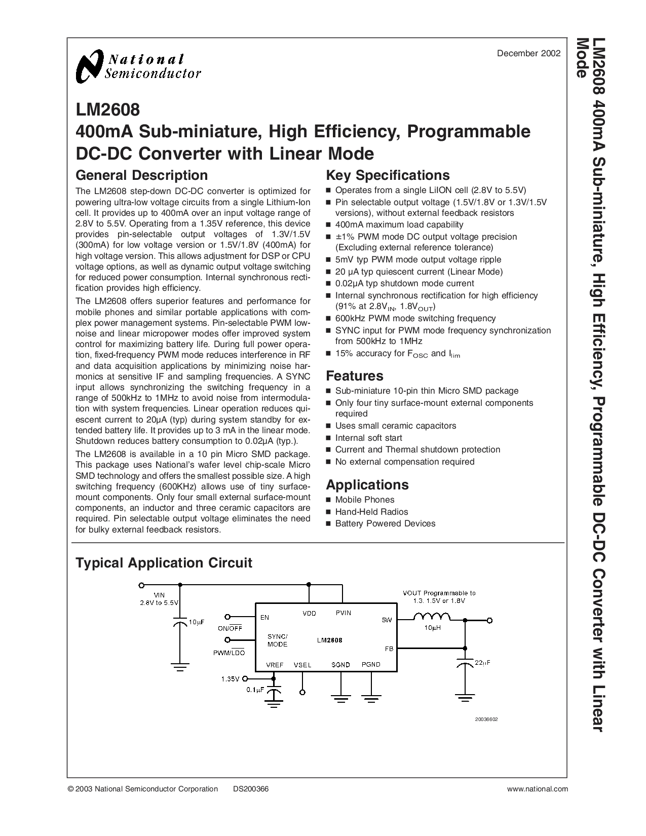 LM2608 400mA 超小型, 高 效率, 可编程 直流-直流 变频器 与 线性