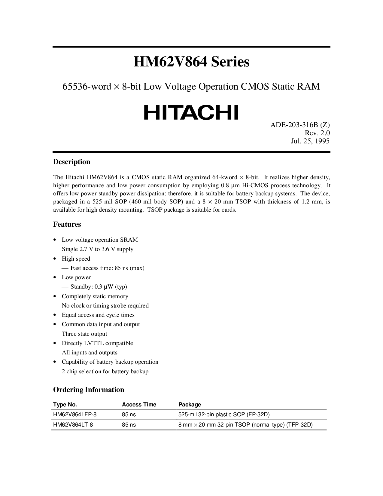 这 hitachi hm62v864 是 一个 cmos 静态 ram 有组织的 64-kword