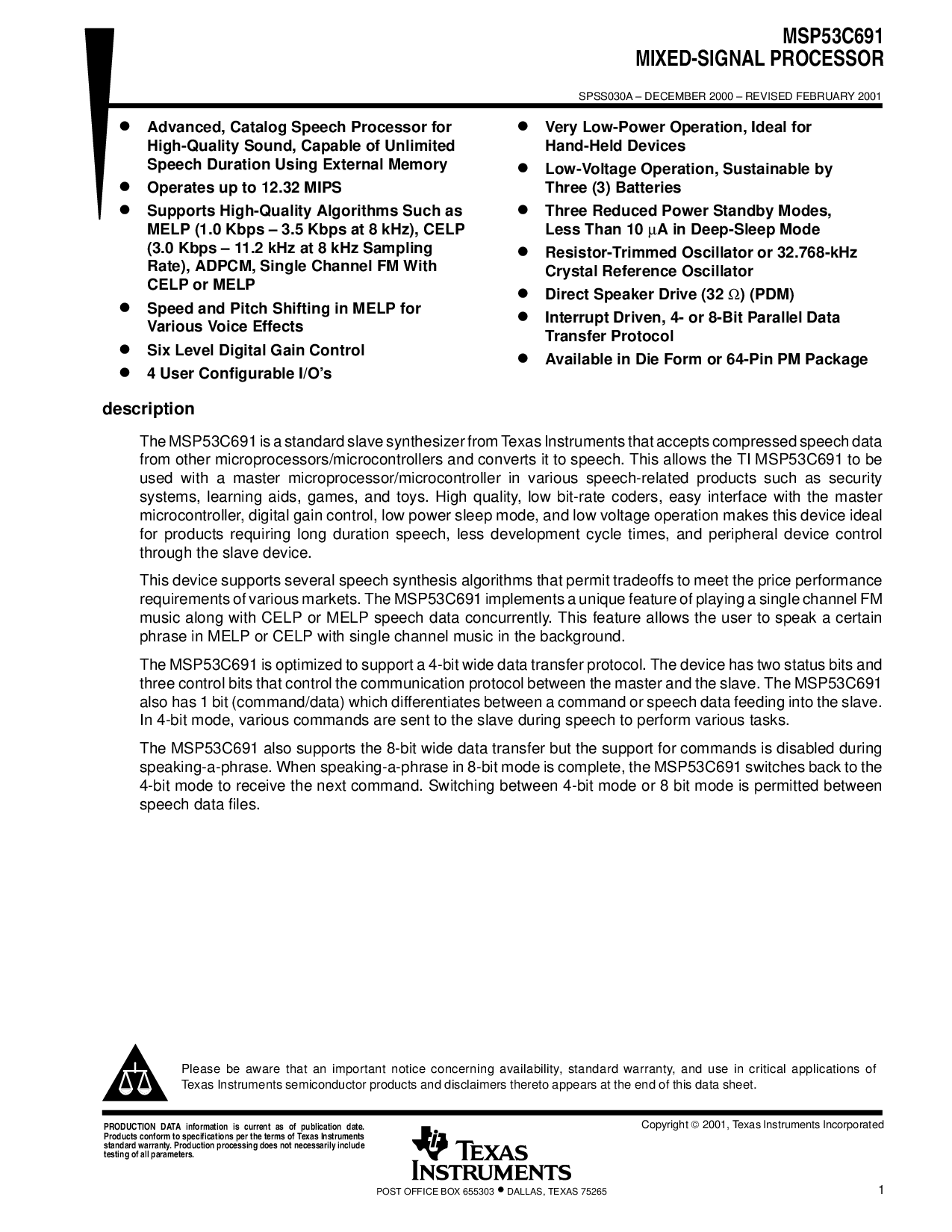 这 msp53c691 是 一个 标准 奴隶 合成器 从 德州 仪器仪表 那 接受 已压缩 演讲 数据