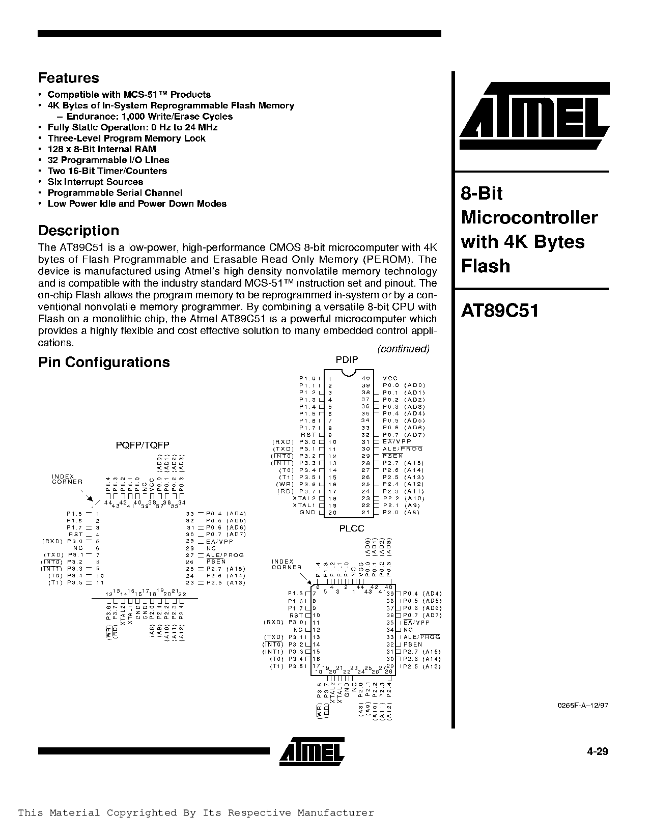 浏览型号AT89C51-12AA 的Datasheet PDF文件第4页