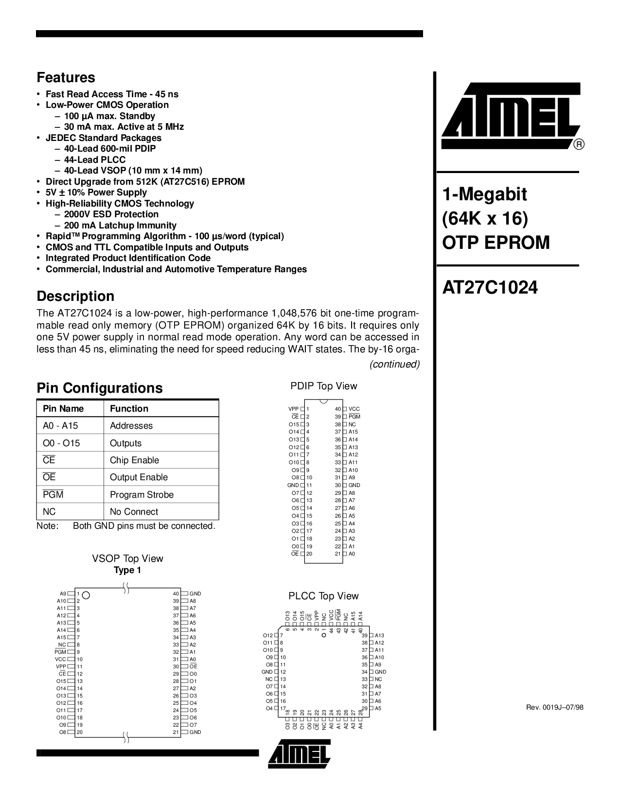 这 at27c1024 是 一个 低-电源, 高性能 1,048,576 有点 一次性 程序-