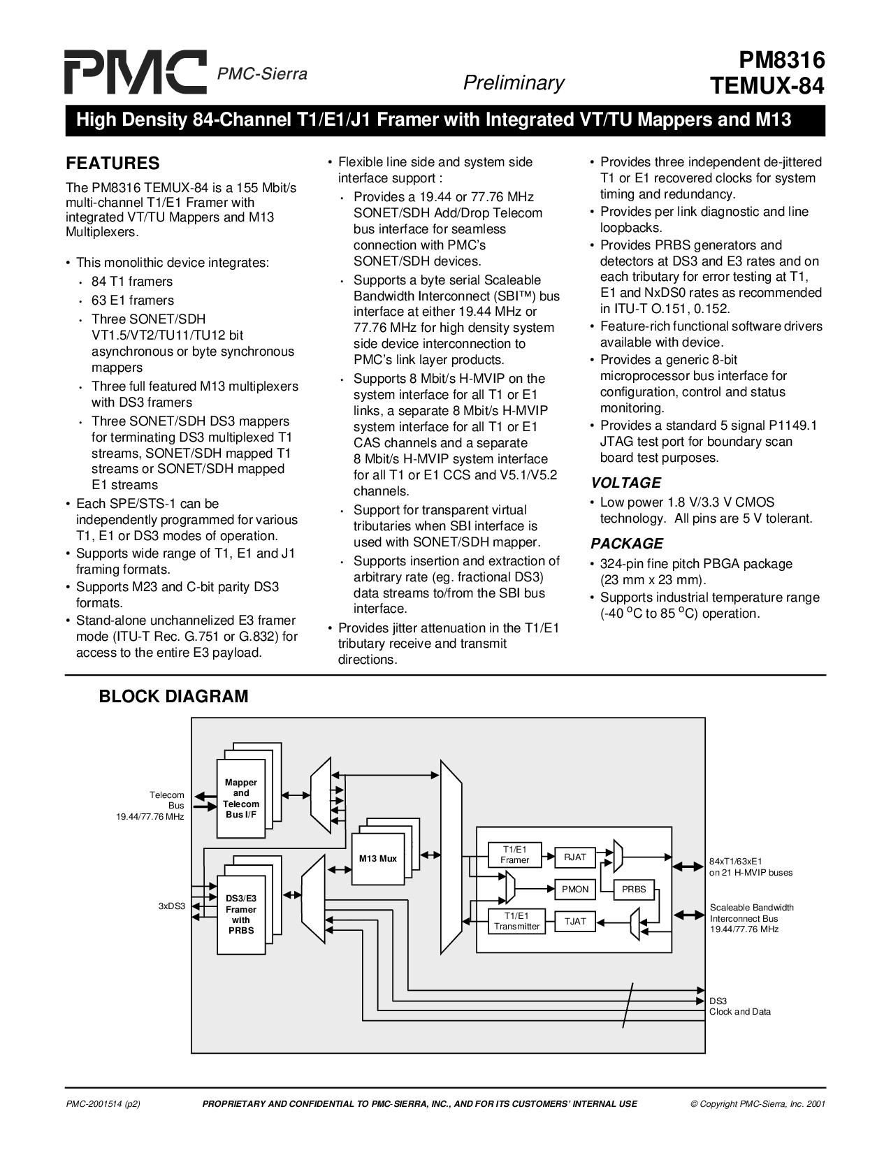 高 密度 84-频道 t1/e1/j1 成帧器 与 综合 vt/tu mappers 和 m13