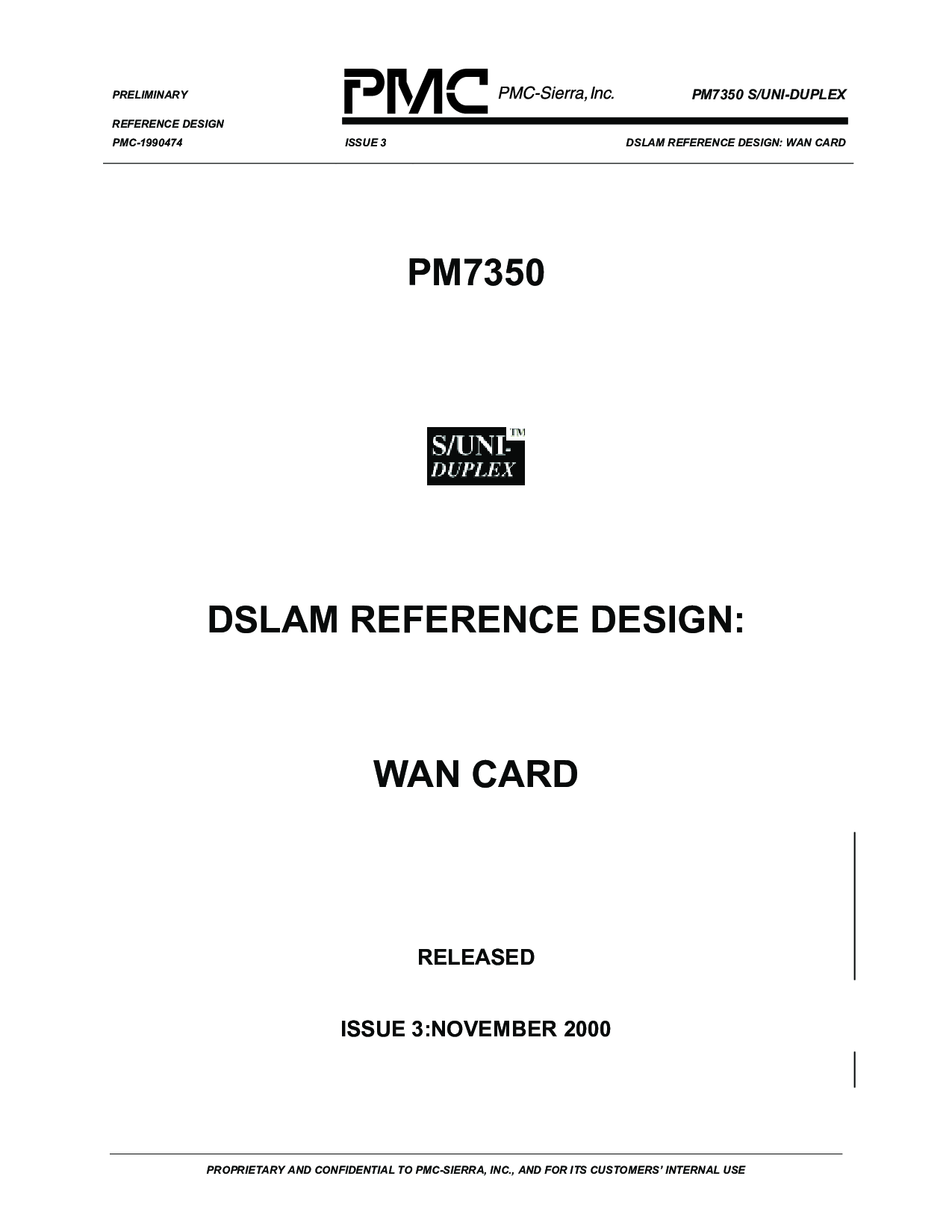初步 pm7350 s/uni-双工 参考 设计 pmc-1990474 问题 3 dslam 参考 设计: wan 卡片 专有 和 confidential 至 pmc-sierra, 股份有限公司., 和 用于 其 客户’ 内部 使用 PM7350 dslam 参考 设计: wan 卡片 释放 问题 3:十一月 2000 | |