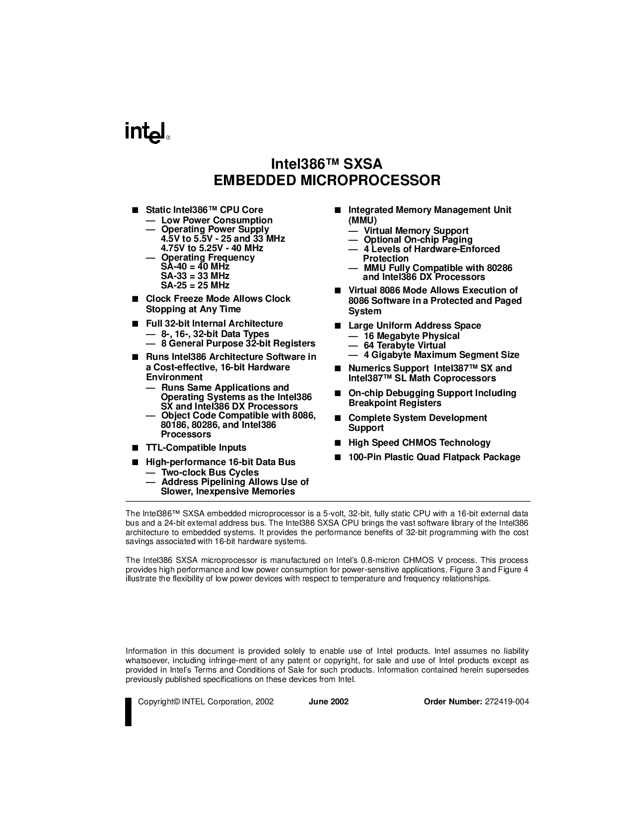这 Intel386™ SXSA 嵌入式 微处理器 是 一个 5-电压, 32-有点, 完全 静态 CPU 与 一个 16-有点 外部 数据