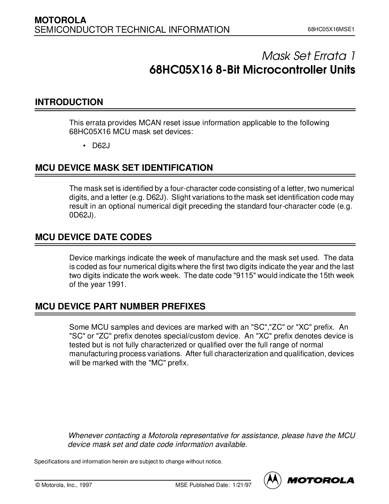 © 摩托罗拉, 股份有限公司., 1997 mse 已发布 日期: 1/21/97