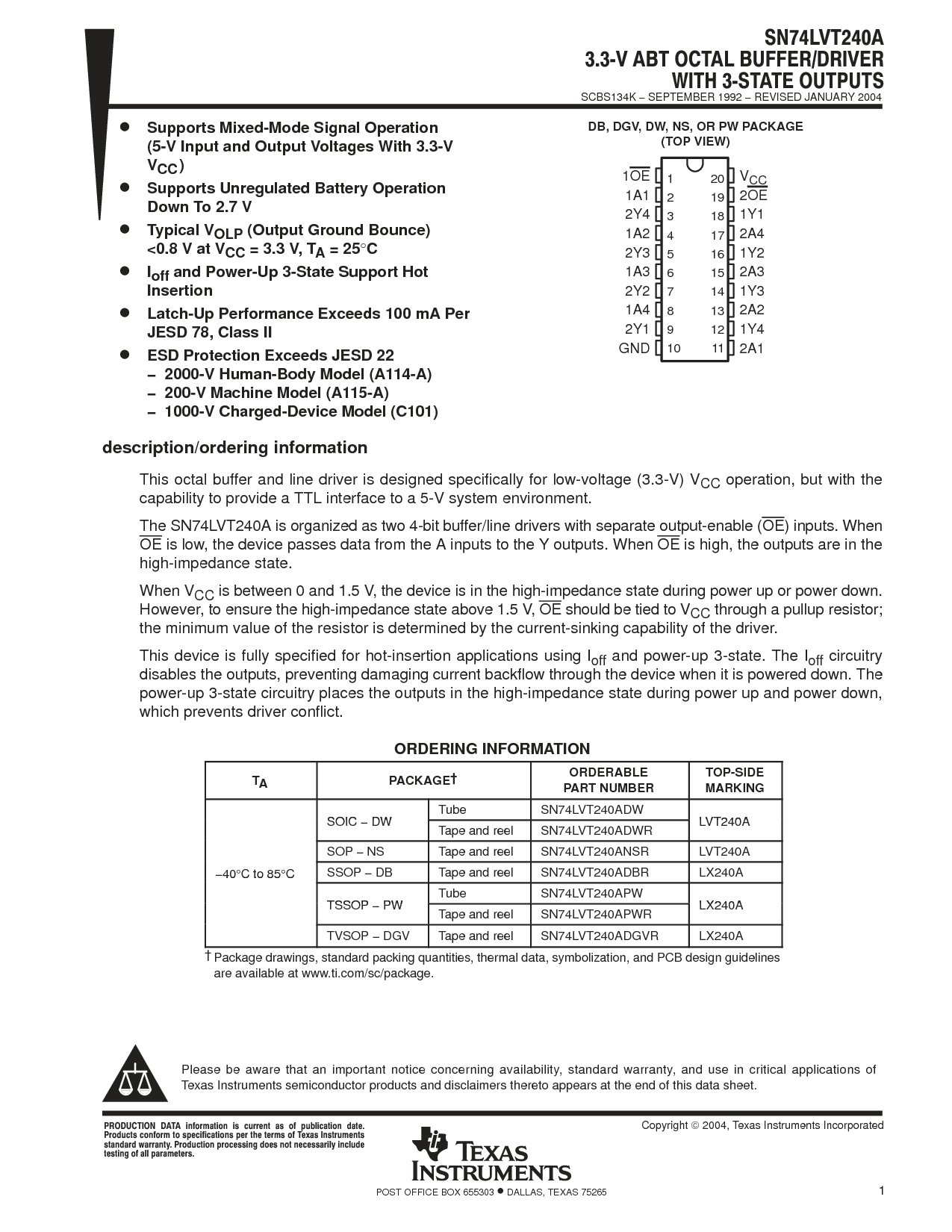 这 sn74lvt240a 是 有组织的 作为 两个 4-有点 buffer/线驱动程序 与 分开 输出-启用 (oe