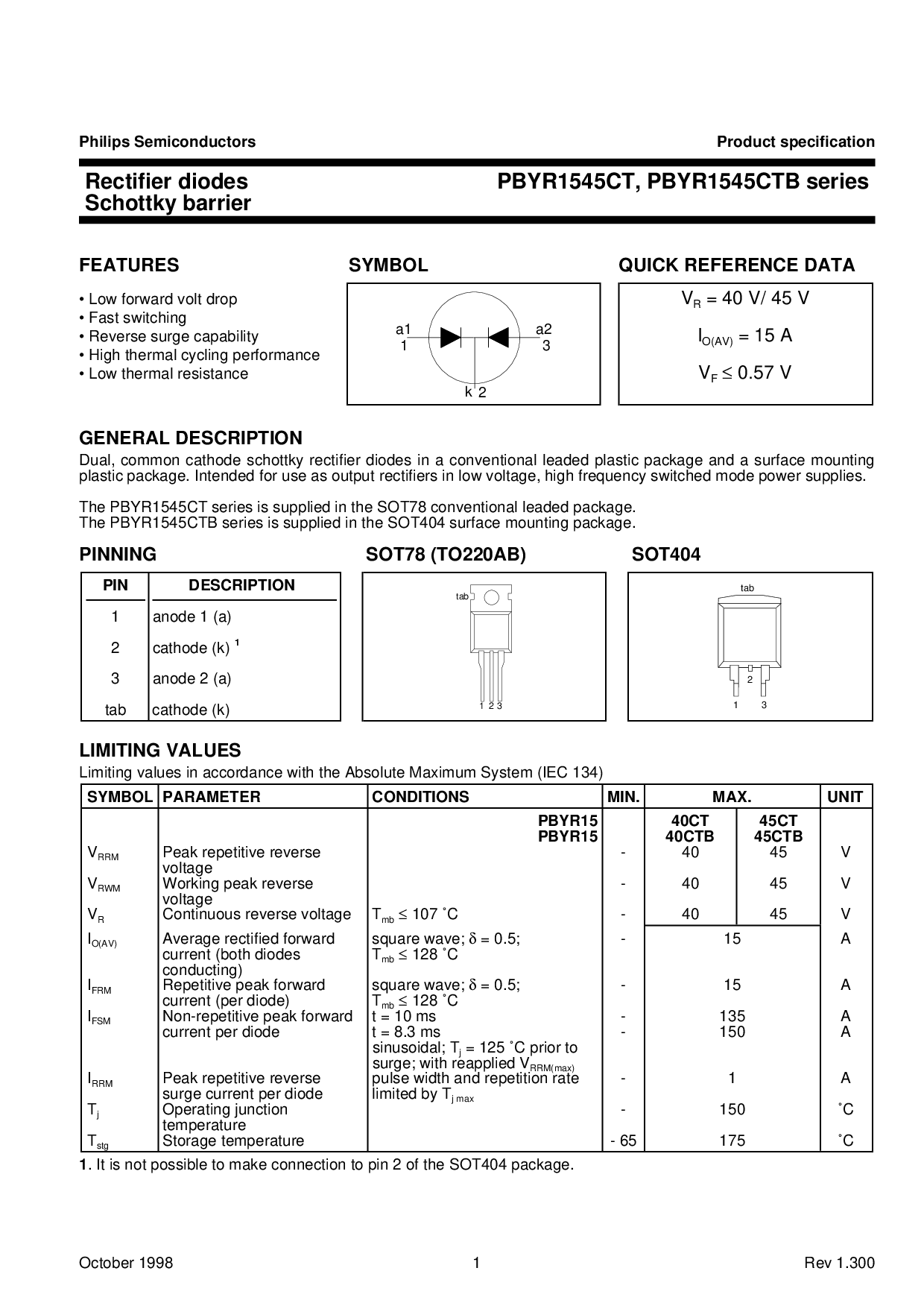 这 PBYR1545CT 系列 是 提供的 入点 这 SOT78 常规 含铅 包装.