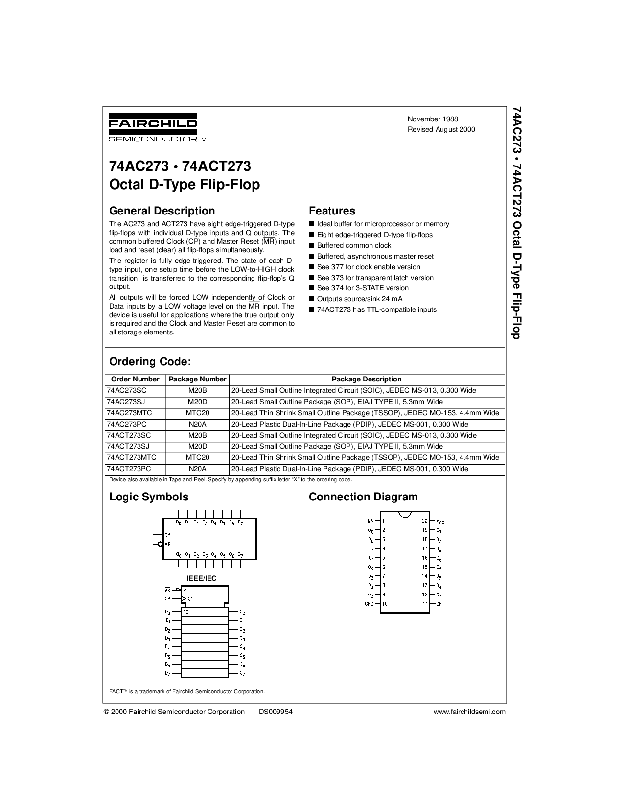 74AC273SC M20B 20-铅 小 大纲 综合 电路 (soic), 电子元件工业联合会 ms-013, 0.300 宽
