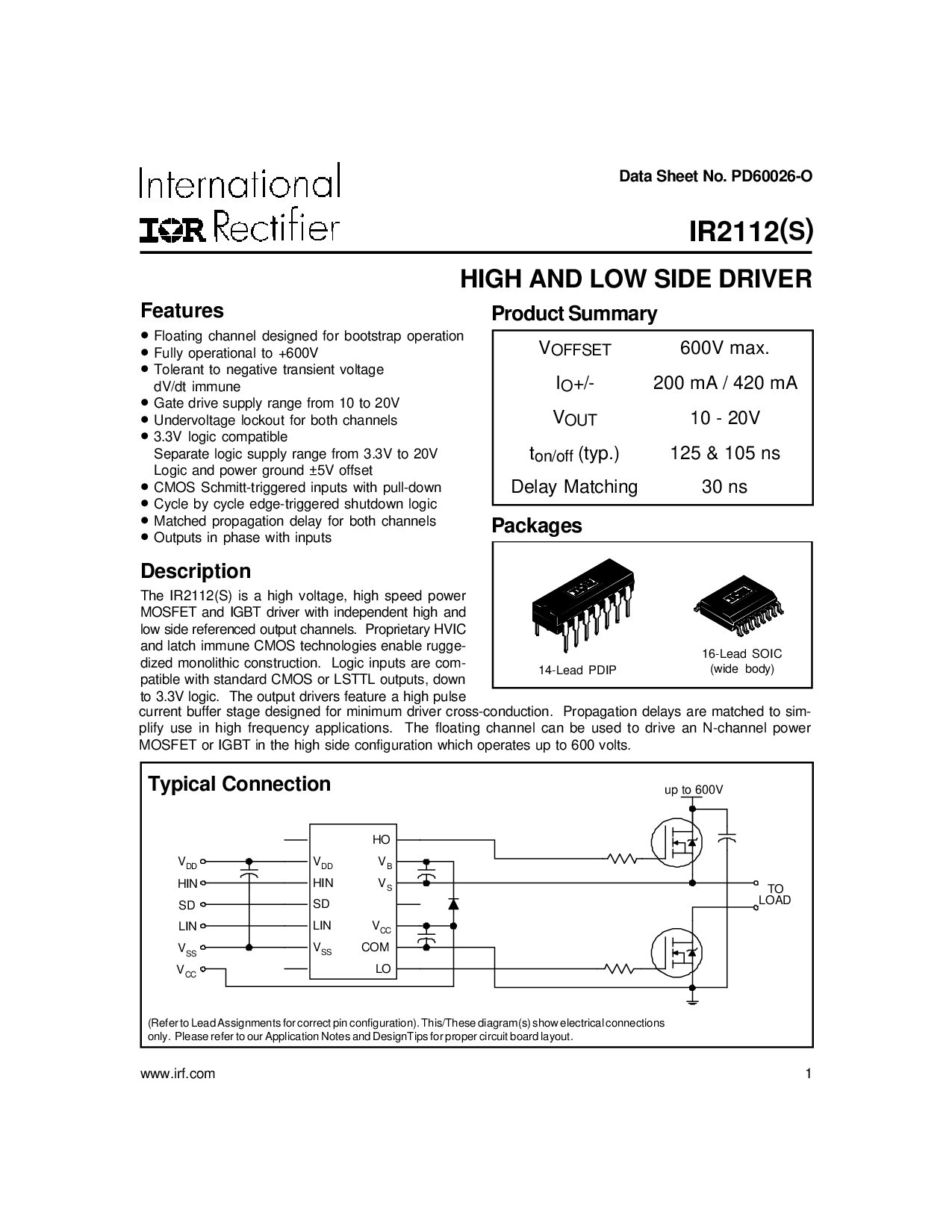 这 ir2112(s) 是 一个 高 电压, 高 速度 电源