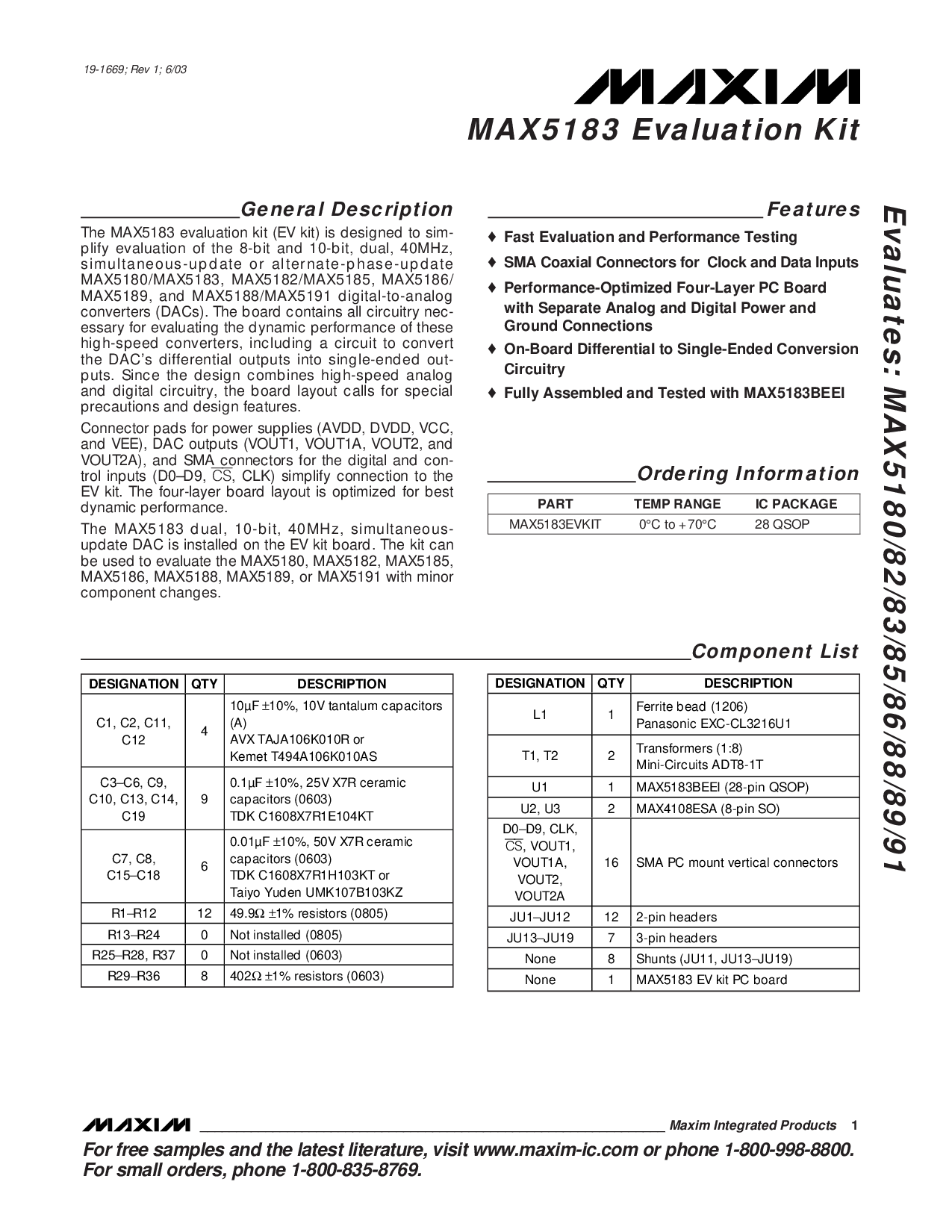 用于 免费 样品 和 这 最新 文学, 参观 www.马克西姆-集成电路.com 或 电话 1-800-998-8800.