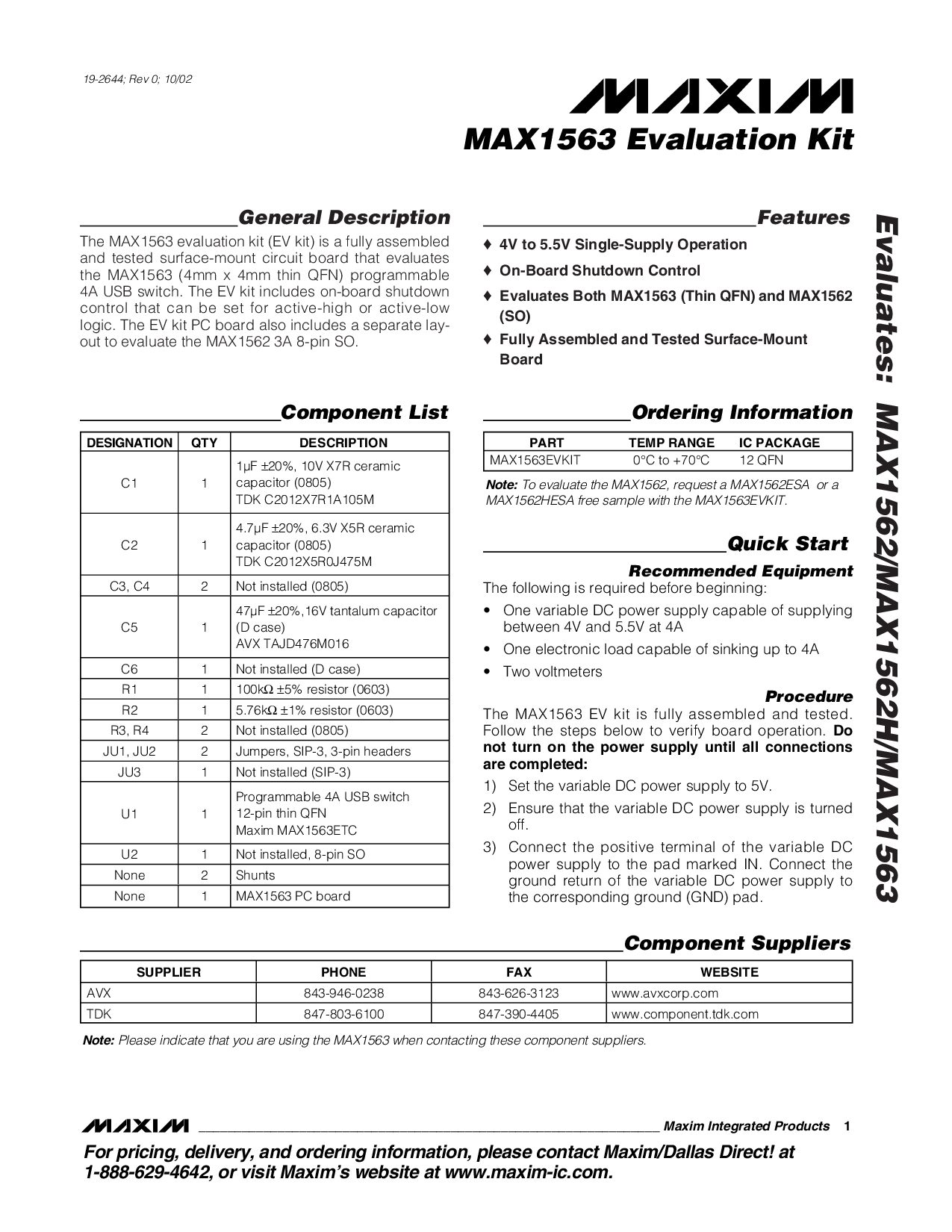 max1562hesa 免费 样品 与 这 max1563evkit.