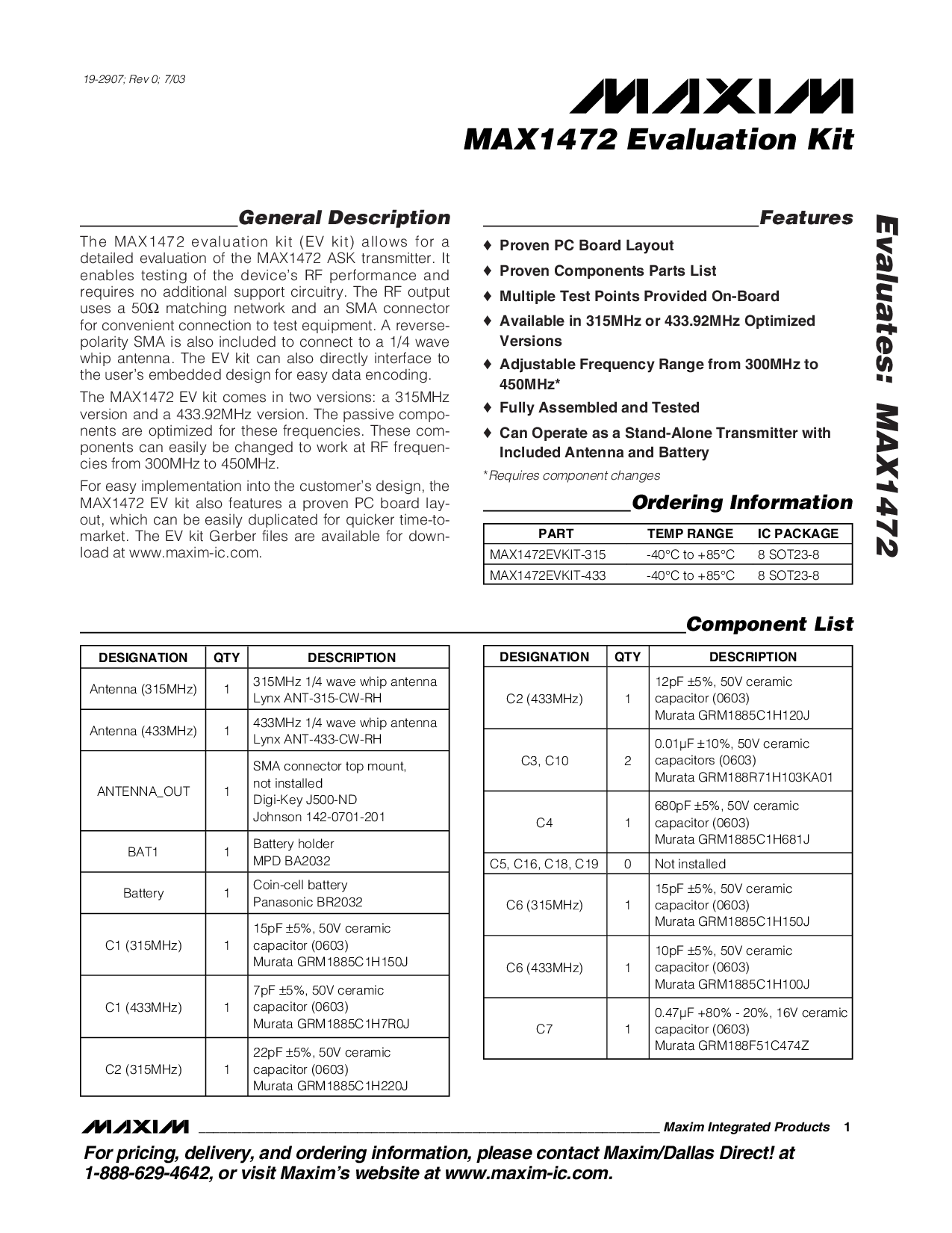 这 max1472 电动汽车 工具包 来 入点 两个 版本: 一个 315mhz