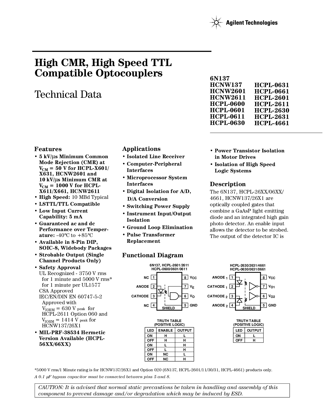 *5000 v rms/1 分钟 评级 是 用于 hcnw137/26x1 和 选项 020 (6n137, hcpl-2601/11/30/31, hcpl-4661) 产品 only.