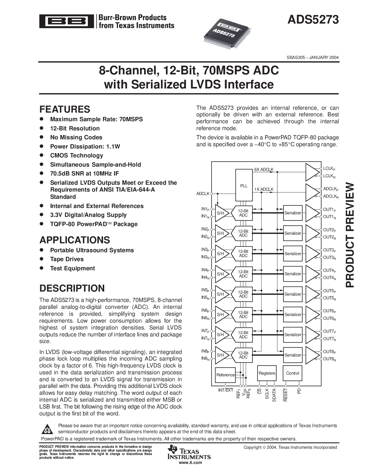 这 ads5273 是 一个高-业绩, 70msps, 8-频道