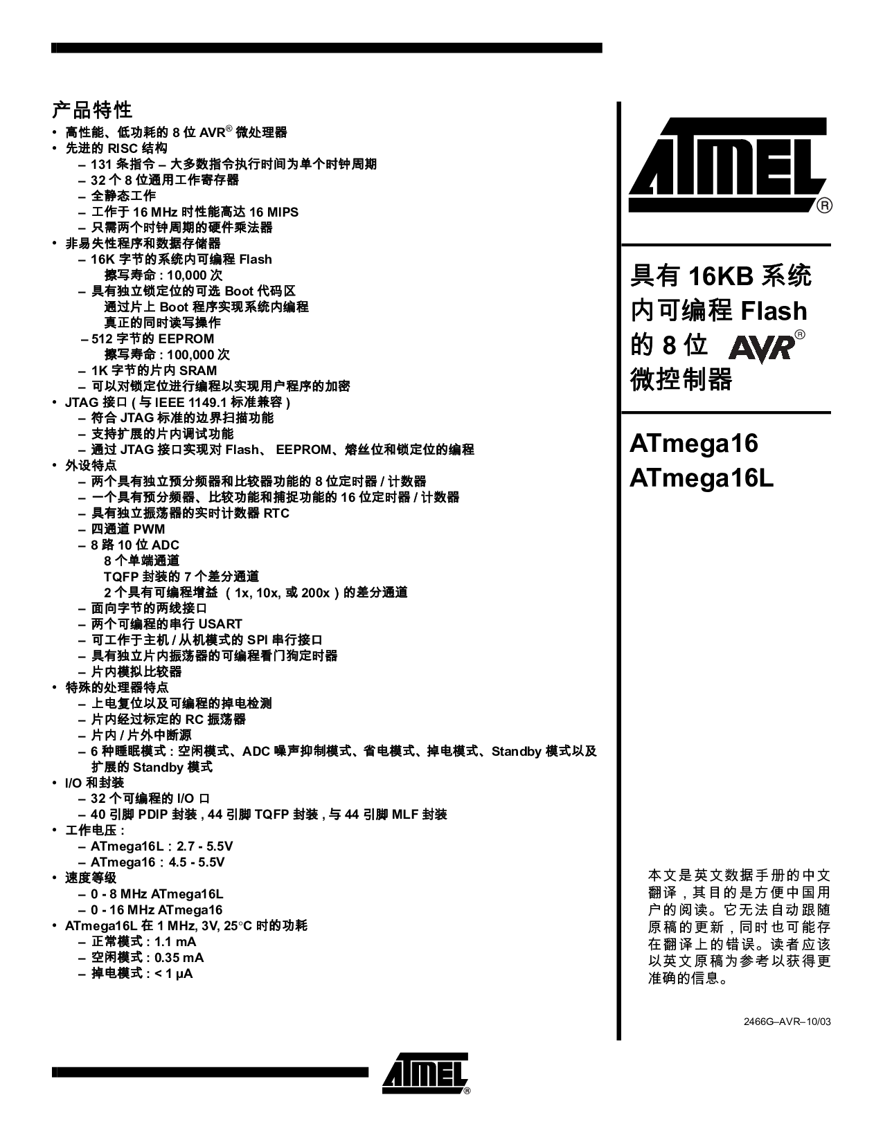 mega16/mega16L 官方中文PDF 官方翻译,330页