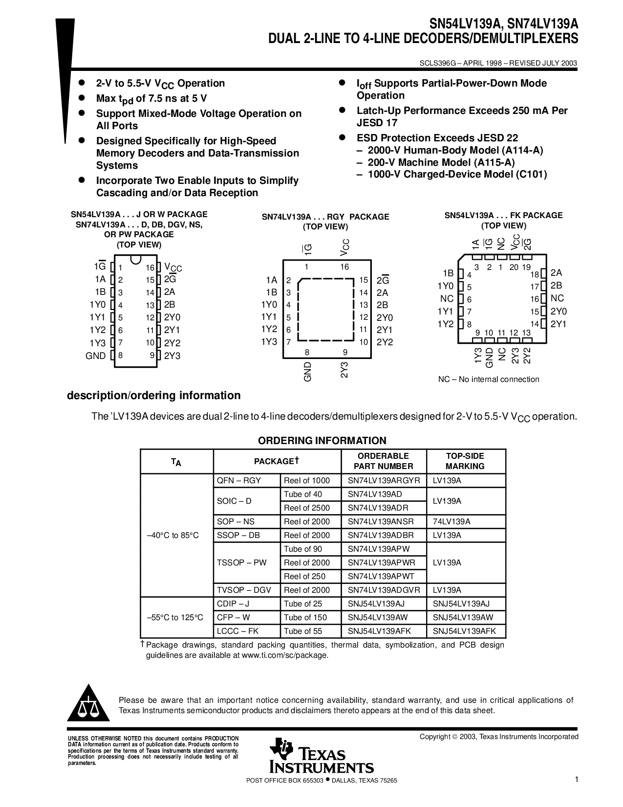 这 ’lv139a 设备 是 双 2-线 至 4-线 解码器/demultiplexers 设计 用于 2-v 至 5.5-v v