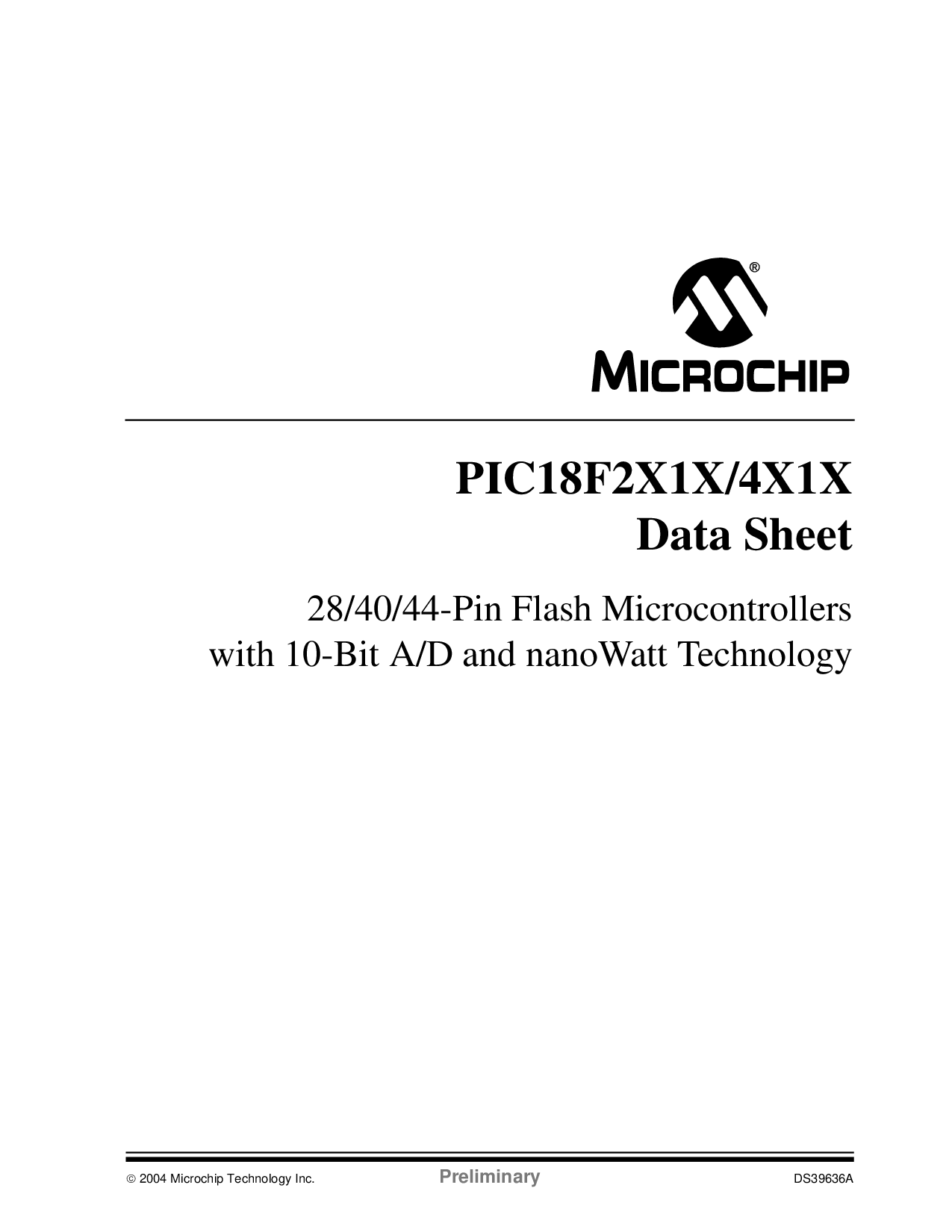 2004 微芯片 技术 公司 初步 DS39636A pic18f2x1x/4x1x 数据 工作表 28/40/44-管脚 闪光灯 微控制器 与 10-有点 一个/d 和 nanowatt 技术 | |