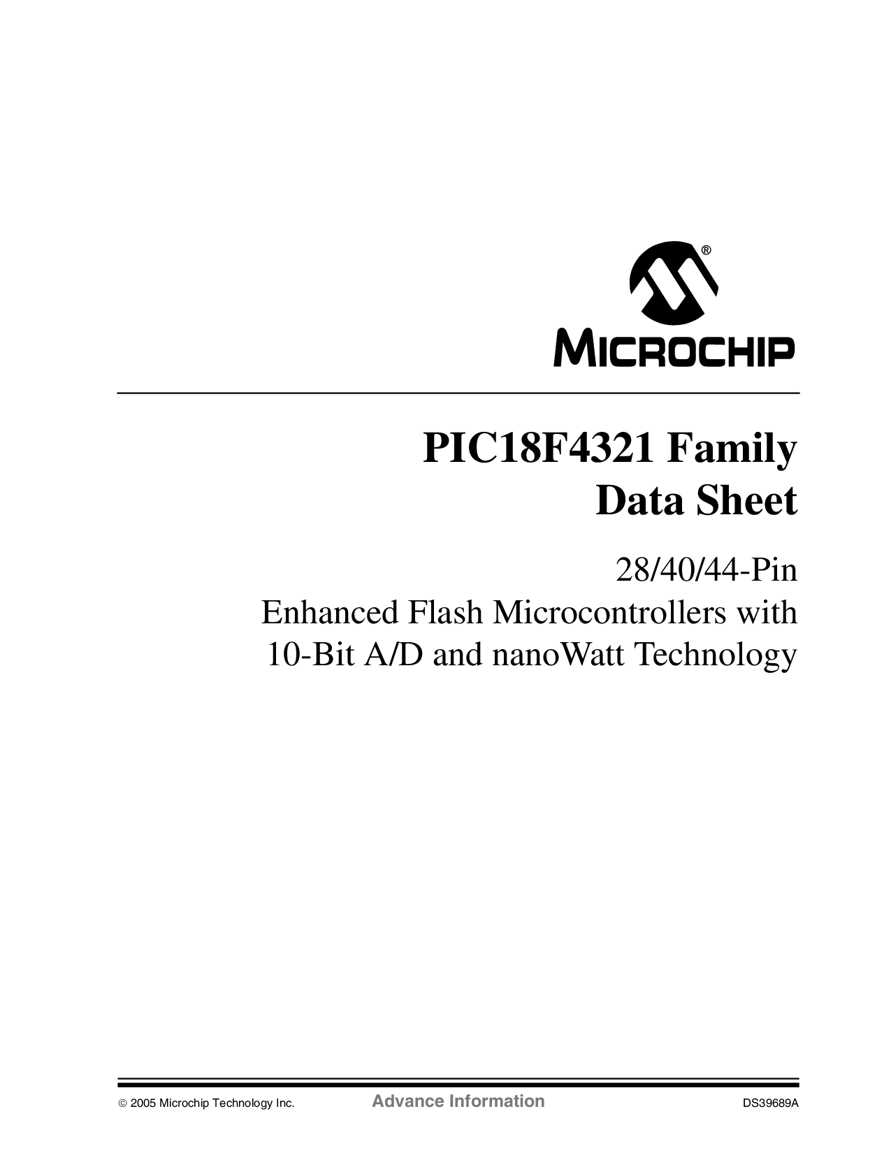 © 2005 微芯片 技术 公司 预付款 信息 DS39689A pic18f4321 家庭 数据 工作表 28/40/44-管脚 增强型 闪光灯 微控制器 与 10-有点 一个/d 和 nanowatt 技术 | |
