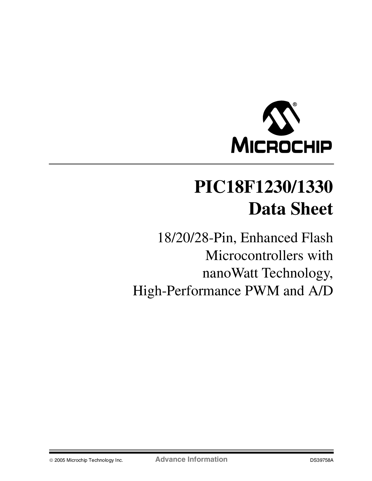 © 2005 微芯片 技术 公司 预付款 信息 DS39758A pic18f1230/1330 数据 工作表 18/20/28-管脚, 增强型 闪光灯 微控制器 与 nanowatt 技术, 高性能 pwm 和 一个/d | |