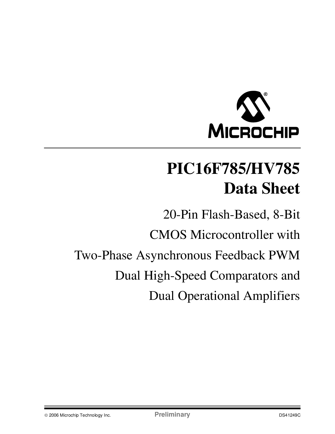 © 2006 微芯片 技术 公司 初步 DS41249C pic16f785/hv785 数据 工作表 20-管脚 闪光灯-基于, 8-有点 cmos 微控制器 与 两相 异步 反馈 pwm 双 高速 比较器 和 双 运营 放大器 | |