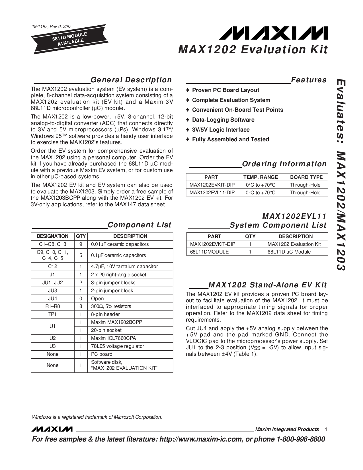这 max1203bcpp 沿 与 这 max1202 电动汽车 工具包. 用于