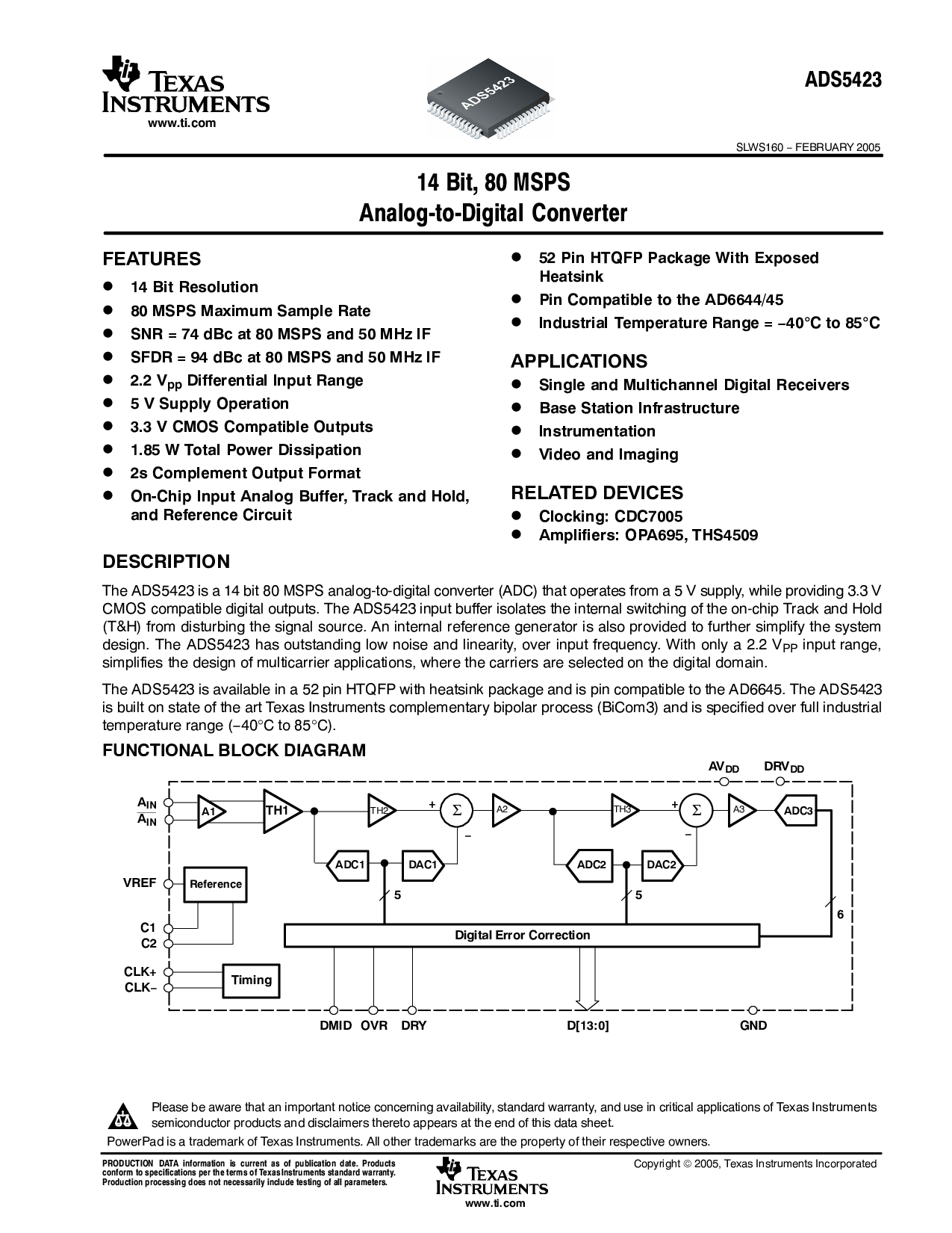 这 ads5423 是 一个 14 有点 80 msps 模数转换 变频器 (adc) 那 操作 从 一个 5 v 供应, 同时 提供 3.3 v