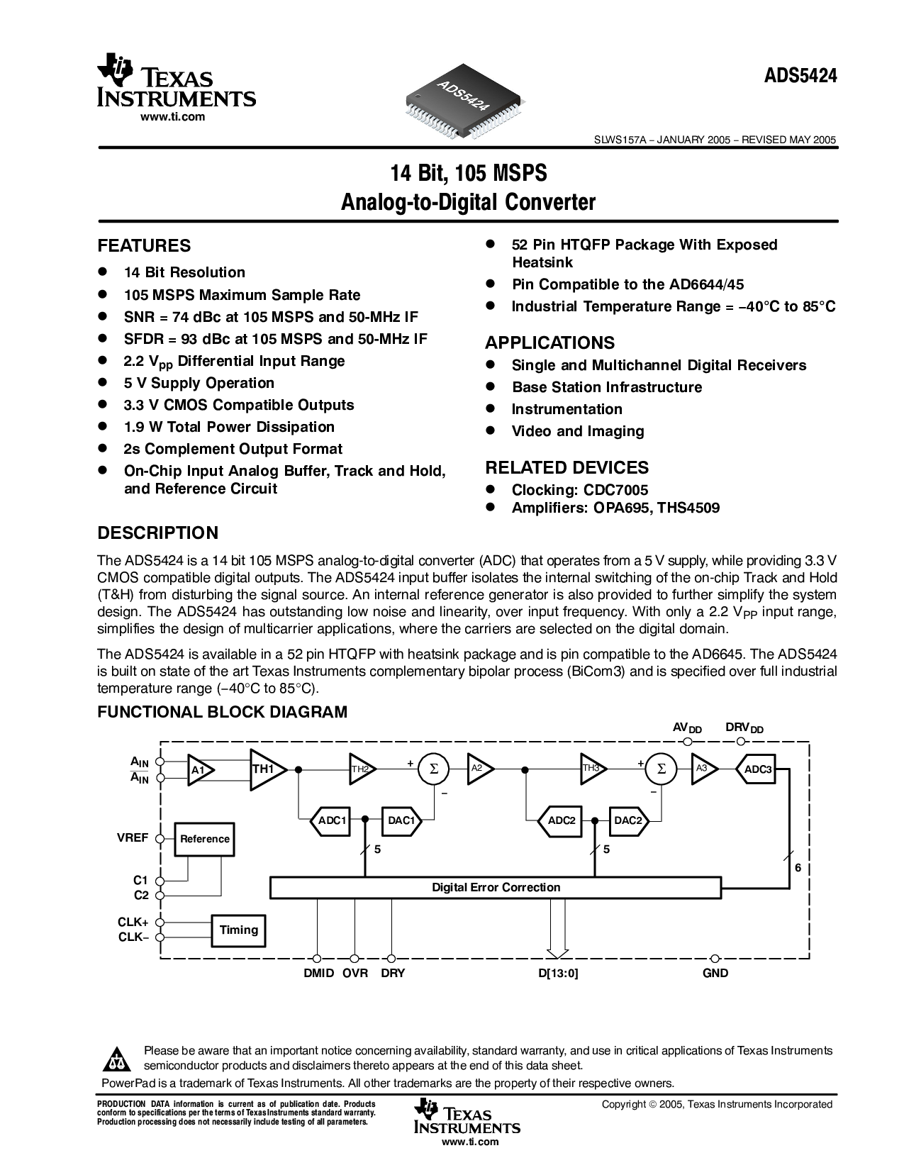 这 ads5424 是 一个 14 有点 105 msps 模数转换 变频器 (adc) 那 操作 从 一个 5 v供应,同时 提供 3.3 v