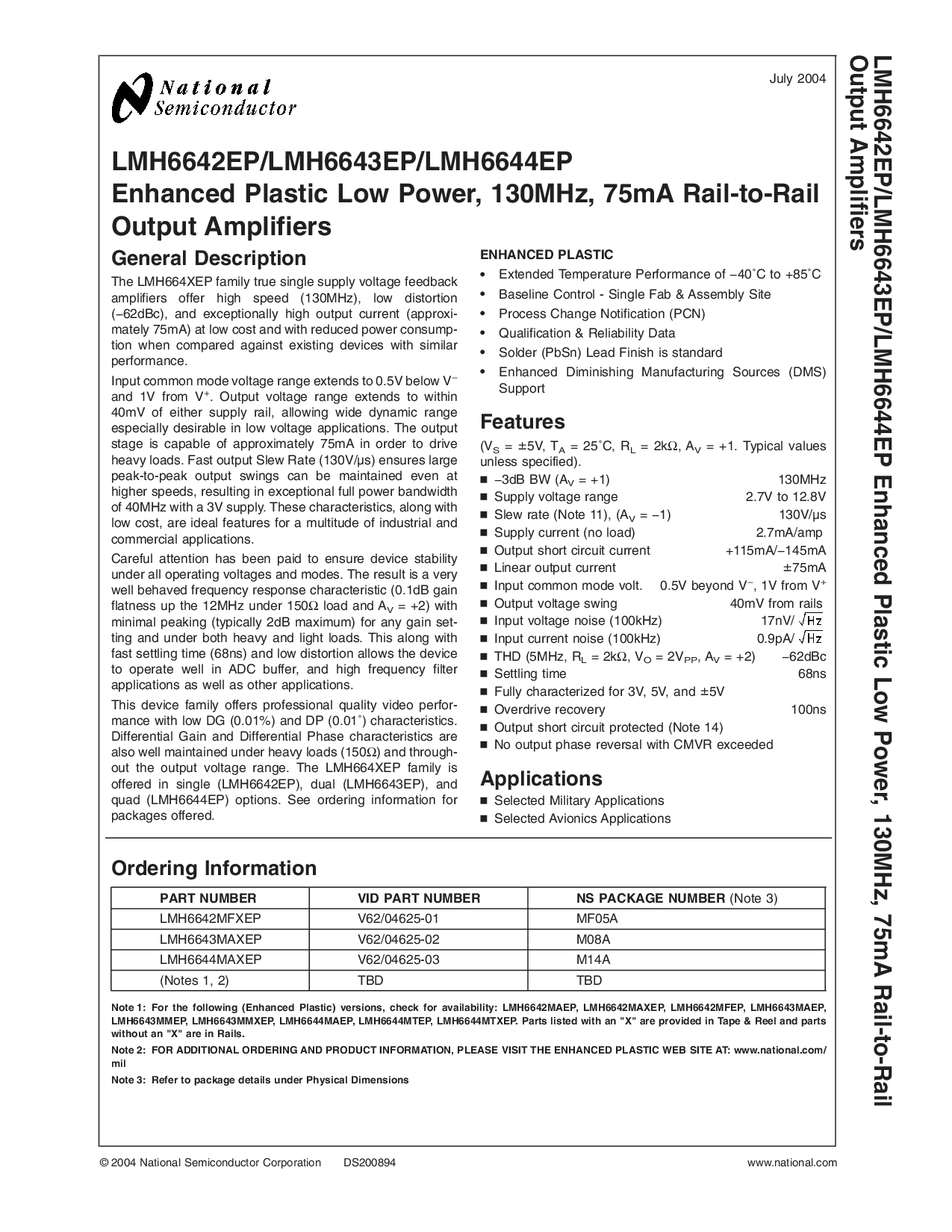 lmh6643mmep, lmh6643mmxep, lmh6644maep, lmh6644mtep, lmh6644mtxep. 零件 已列出 与 一个 "x" 是 提供 入点 胶带 &放大器; 卷轴 和 零件