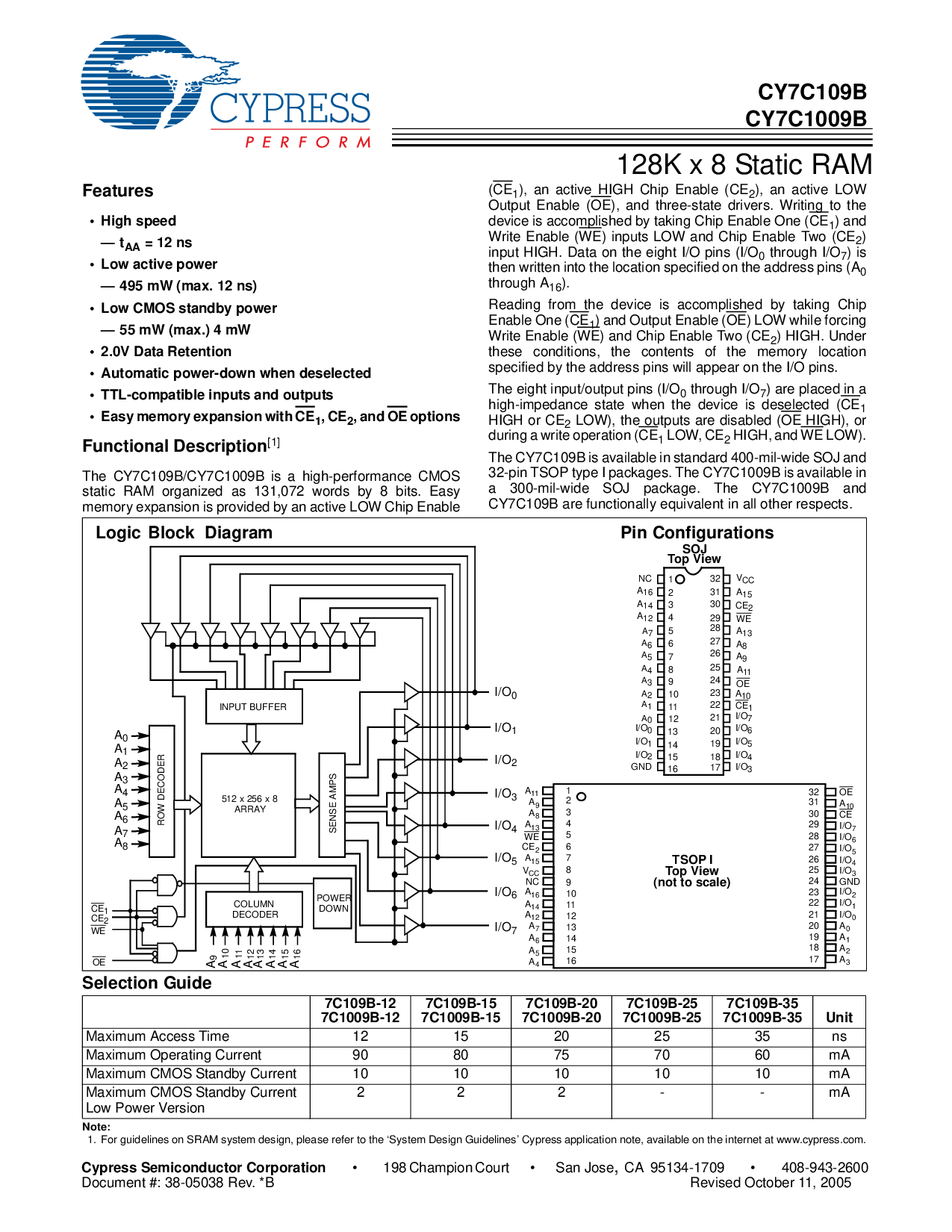 32-管脚 tsop 类型 我 软件包. 这 cy7c1009b 是 可用 入点