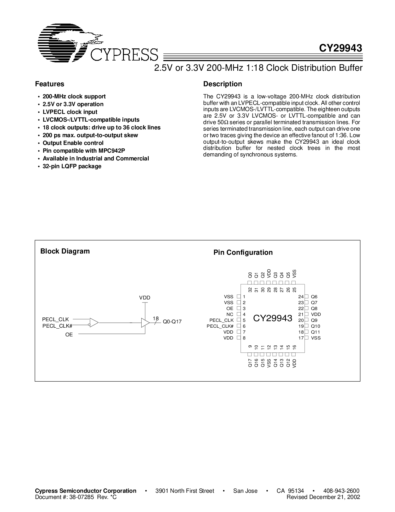 这 cy29943 是 一个 低电压 200-mhz 时钟 分布