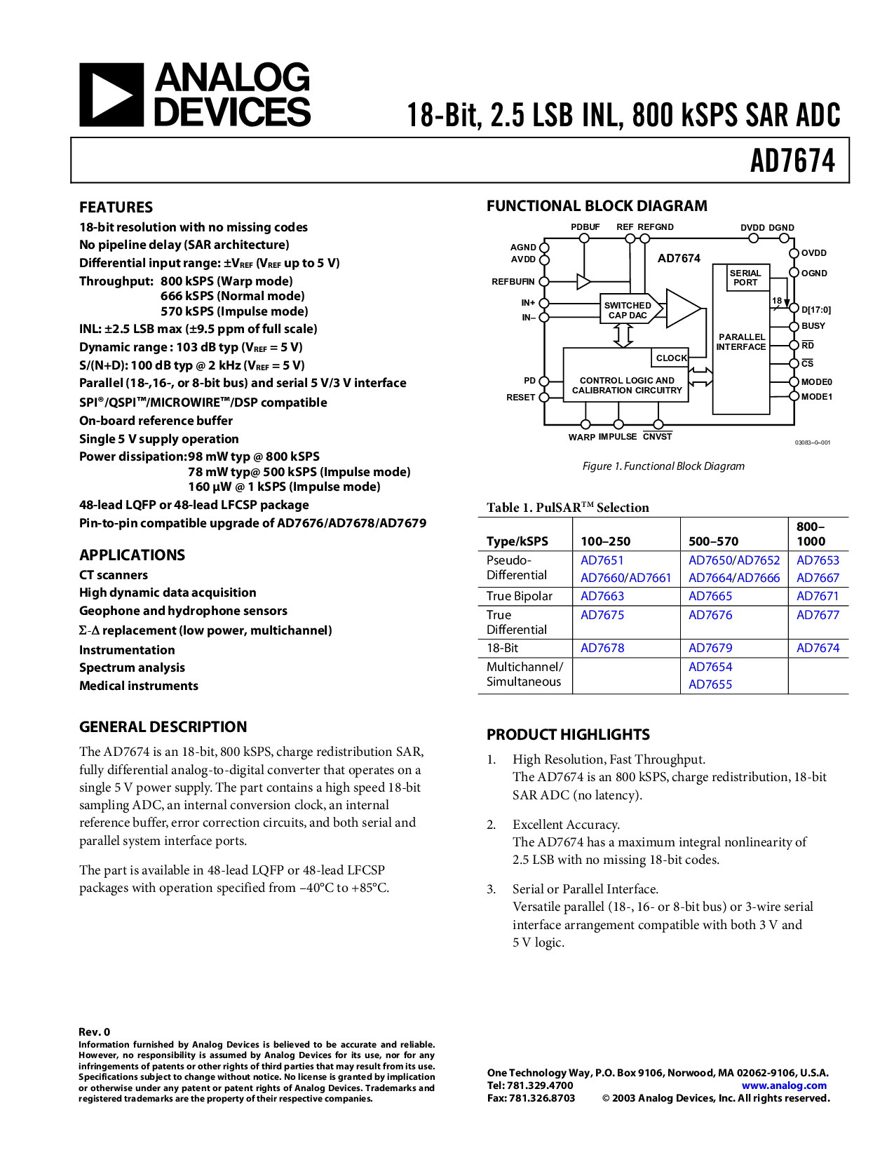 这 ad7674 是 一个 18-有点, 800 ksps, 费用 再分配 sar,