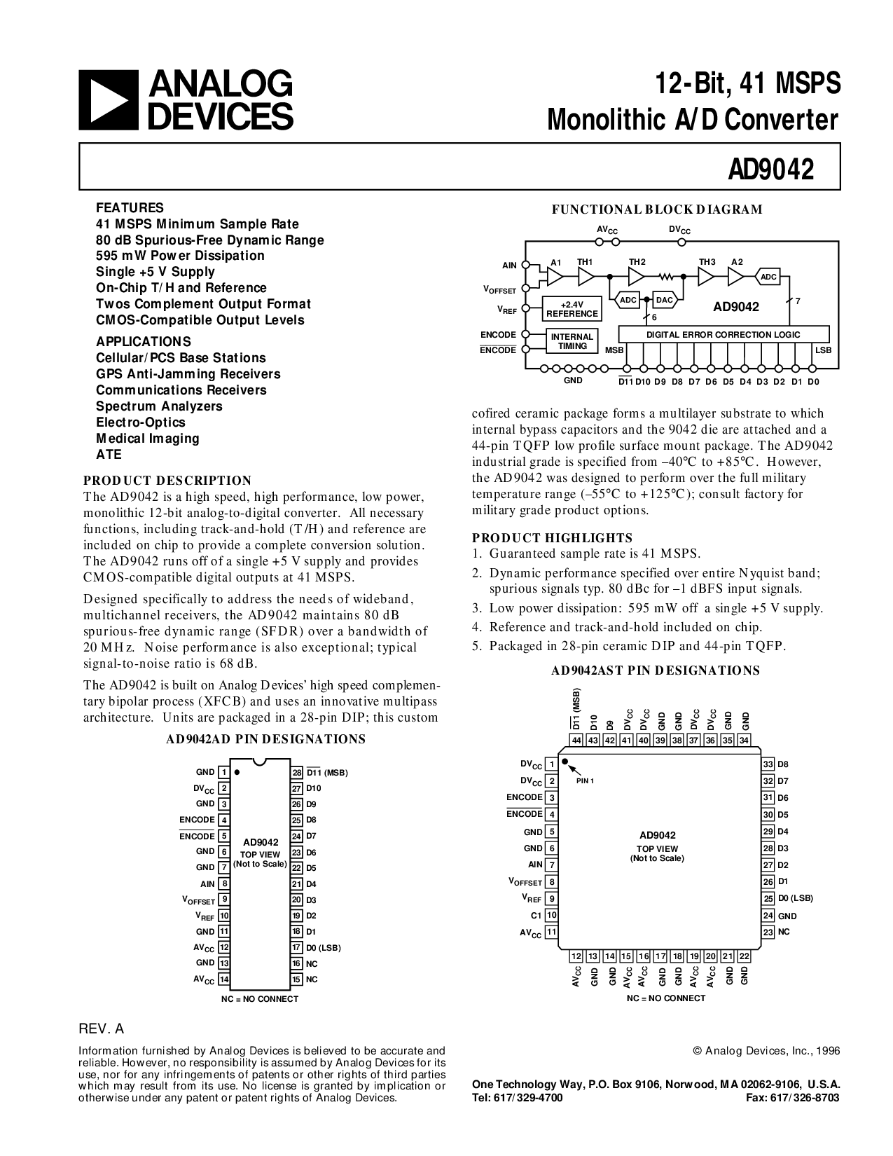 这 ad9042 是 一个 高 速度, 高 业绩, 低 电源,