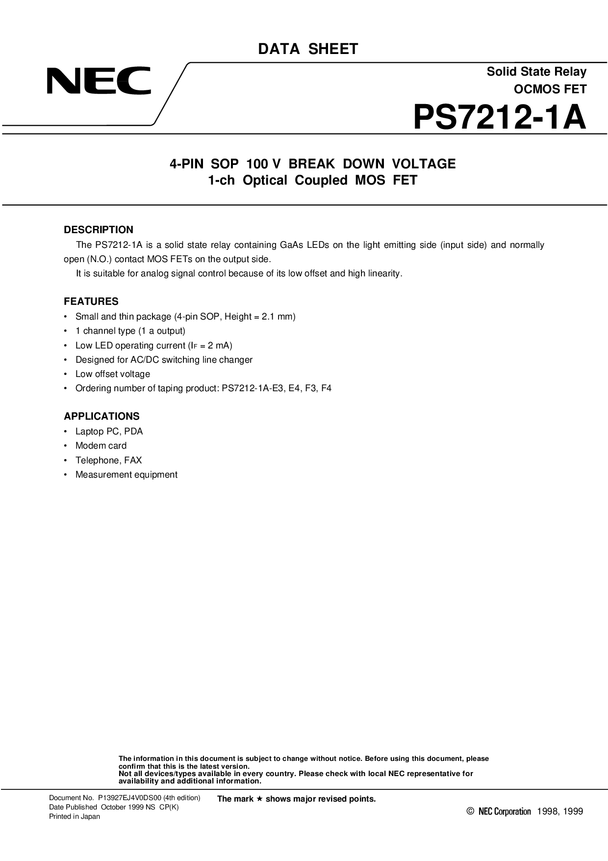 这 ps7212-1a 是 一个 固体 州 继电器 包含 gaas leds 开启 这 灯光 发射 侧面 (输入 侧面) 和 正常情况下