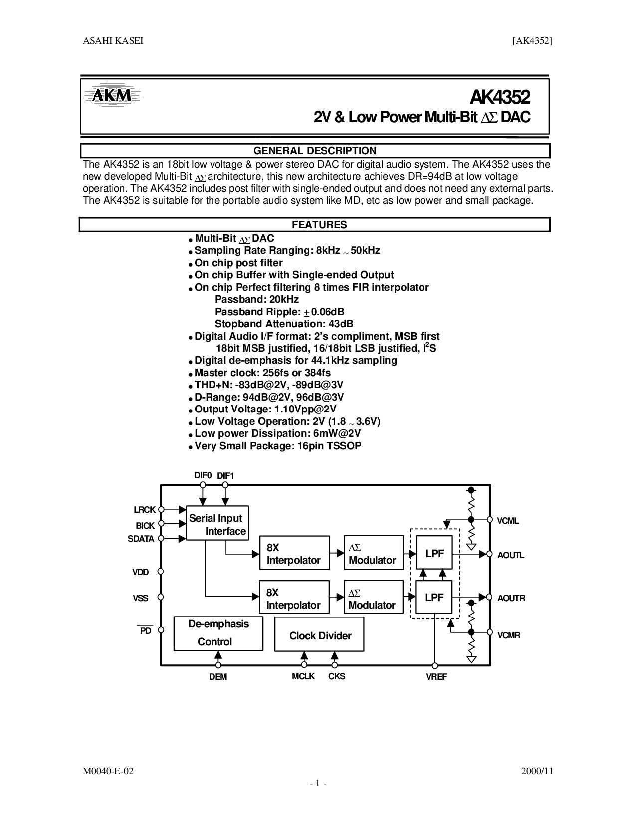 这 ak4352 是 一个 18bit 低 电压 &放大器; 电源 立体声 dac 用于 数字 音频 系统. 这 ak4352 用途 这