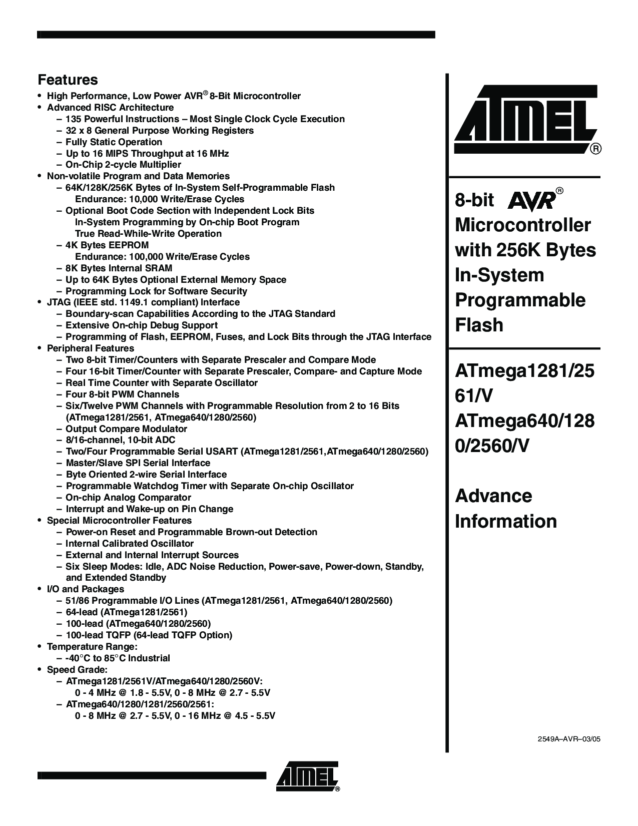 – 两个/四 可编程 串行 usart (atmega1281/2561,atmega640/1280/2560)