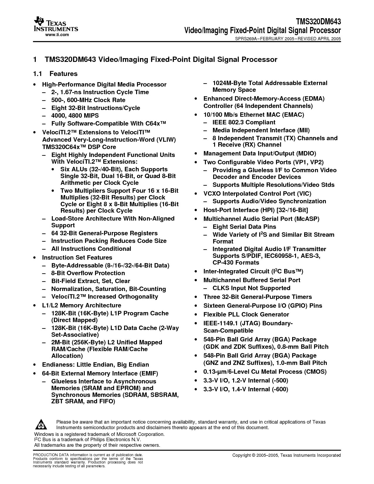 1tms320dm643video/imagingfixed-pointdigitalsignalprocessor
