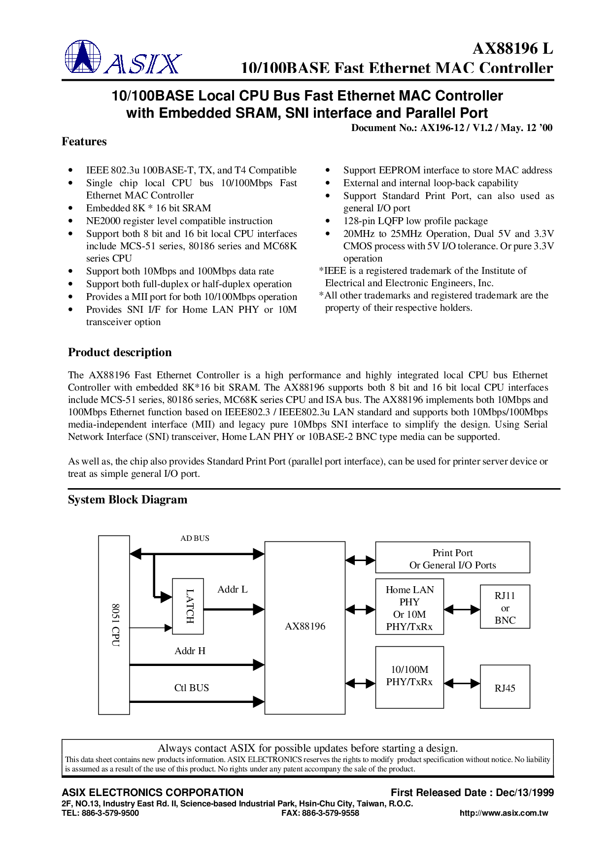 asix 电子产品 公司 第一 释放日期 : 12月/13/1999