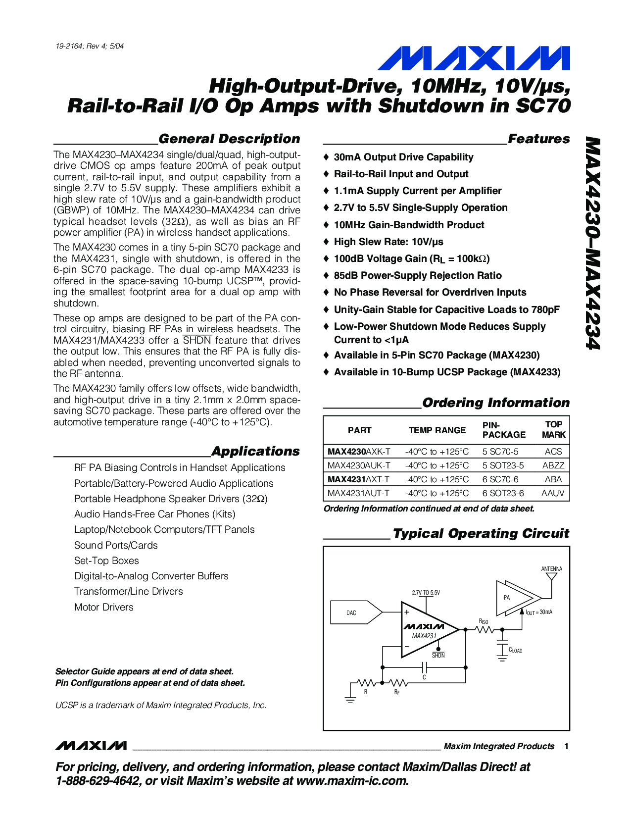 6-管脚 sc70 包装. 这 双 运算放大器 max4233 是