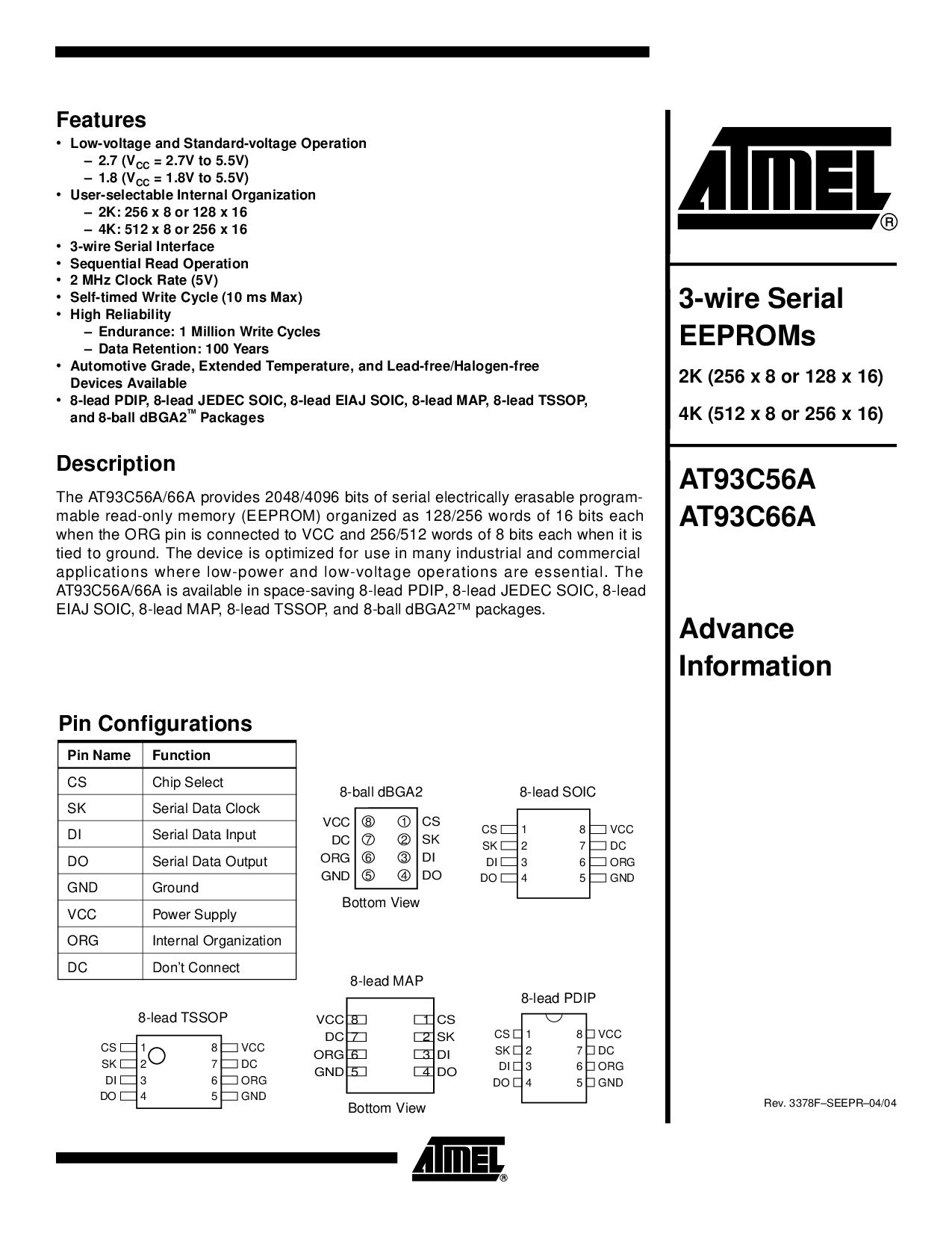 at93c56a/66a 是 可用 入点 节省空间 8-铅 pdip, 8-铅 电子元件工业联合会 soic, 8-lead