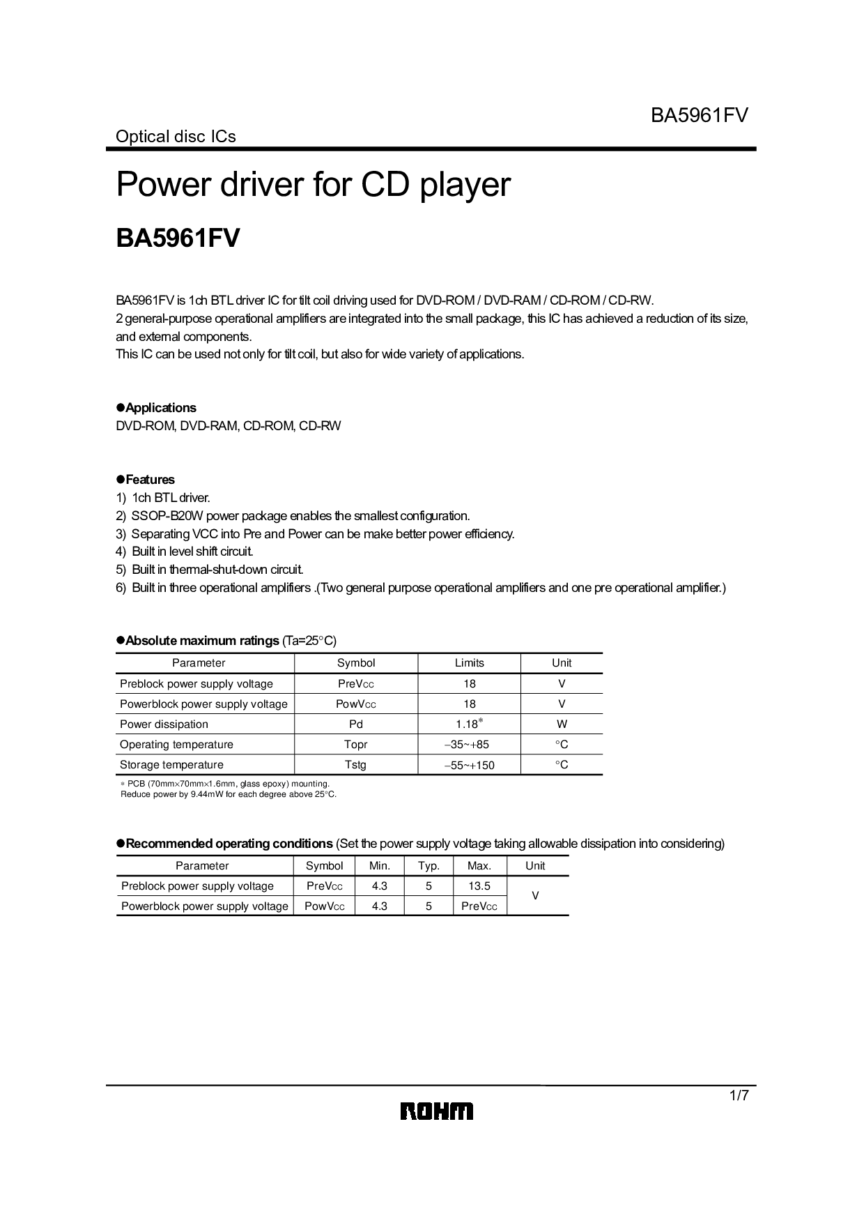 ba5961fv 是 1ch btl 驾驶员 集成电路 用于 倾斜 线圈 驾驶 已使用 用于 dvd-rom / dvd-ram / 光盘-rom / 光盘-rw.