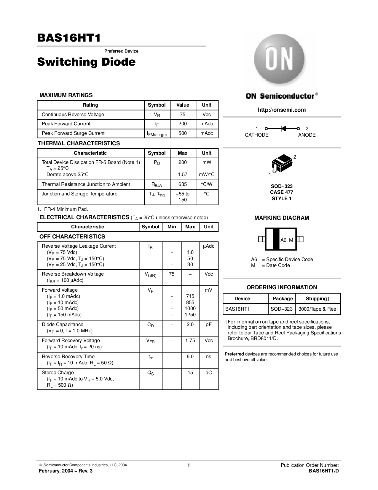 BAS16HT1 SOD−323 3000/胶带 &放大器; 卷轴