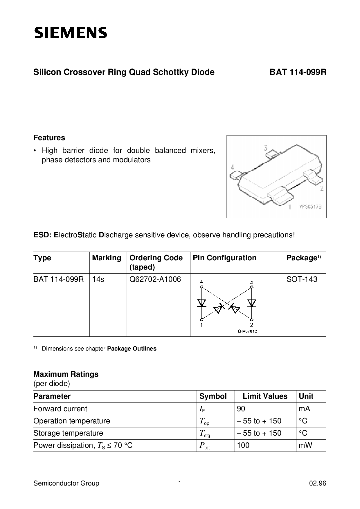 Silicon Crossover Ring Quad Schottky Diode (High barrier diode for double balanced mixers, phase detectors and modulators)