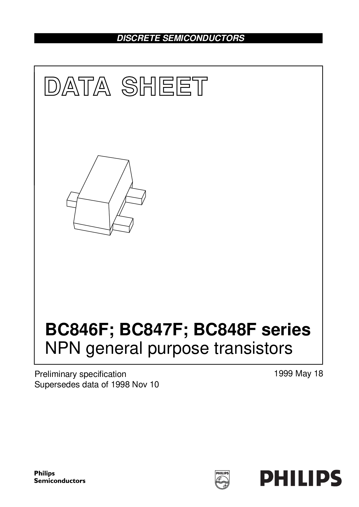 dat一个shEET 初步 Speci 取代 数据 的 1998 十一月 10 1999 将 18 离散 半导体 bc846f; bc847f; bc848f 系列 npn 概述 目的 晶体管 M3D425 | |