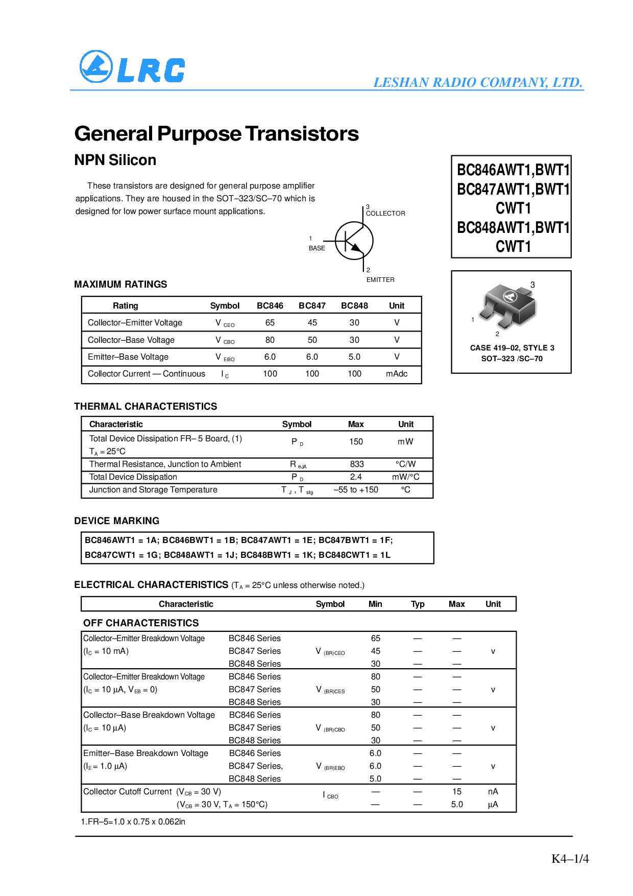 bc847cwt1 = 1g; bc848awt1 = 1j; bc848bwt1 = 1k; bc848cwt1 = 1l