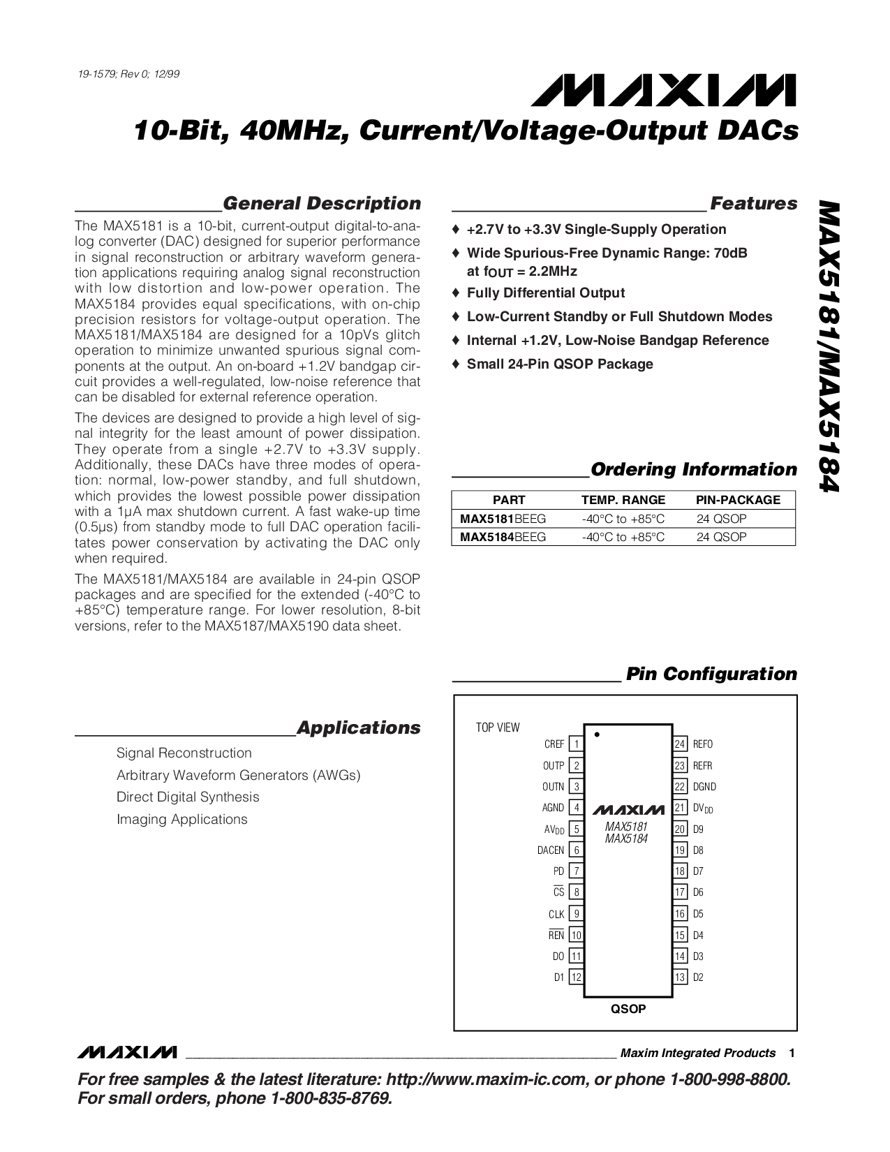 用于 免费 样品 &放大器; 这 最新 文学: http://www.马克西姆-集成电路.com, 或 电话 1-800-998-8800.