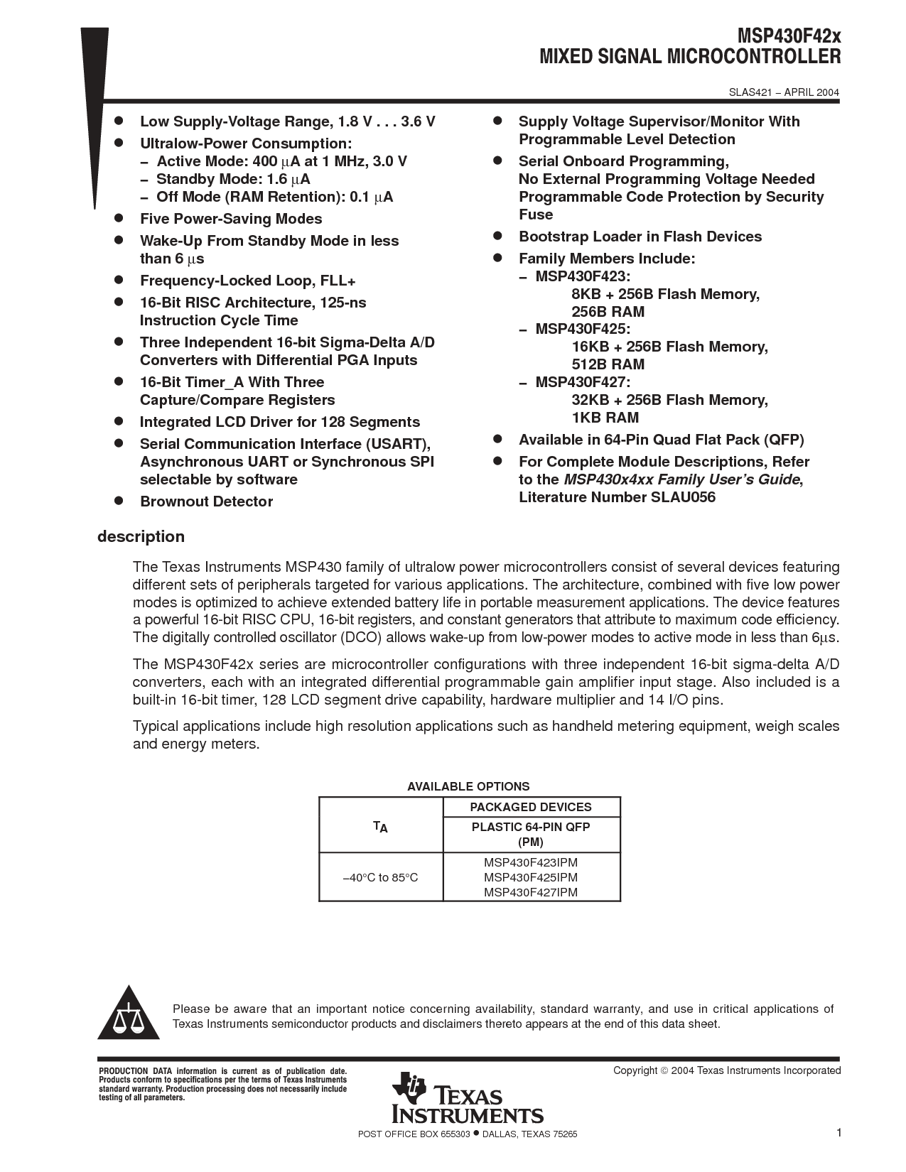 浏览型号MSP430F423的Datasheet PDF文件第2页