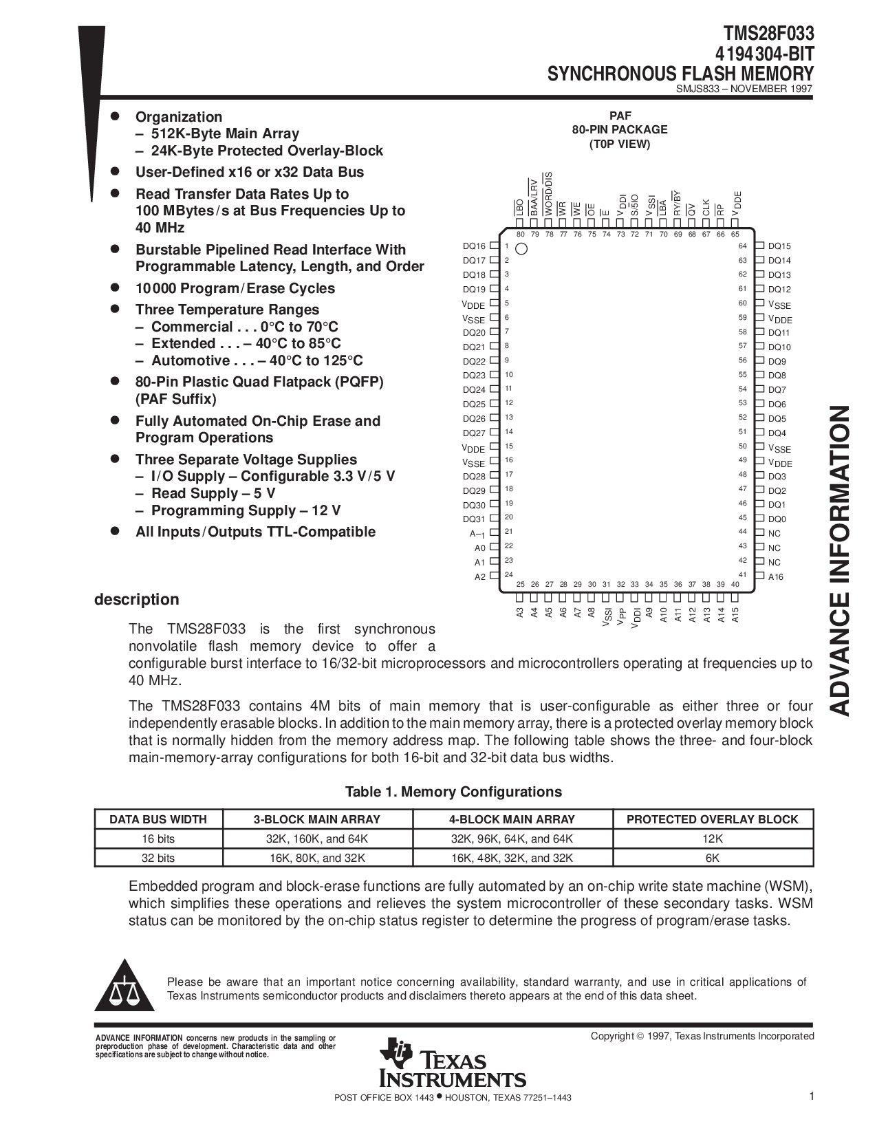 这 tms28f033 包含 4m 比特 的 主 记忆 那 是 用户-可配置 作为 要么 三个 或 四