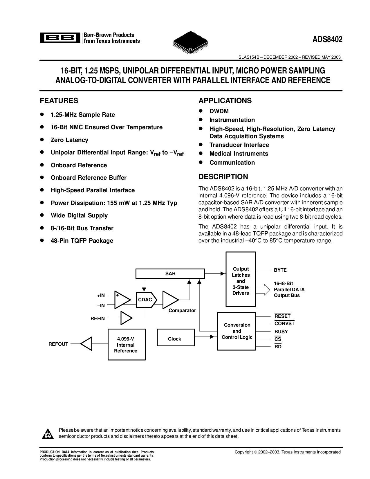 16-BIT, 1.25 MSPS, UNIPOLAR DIFFERENTIAL INPUT, MICRO POWER SAMPLING ANALOG-TO-DIGITAL CONVERTER WITH PARALLEL INTERFACE AND REFERENCE