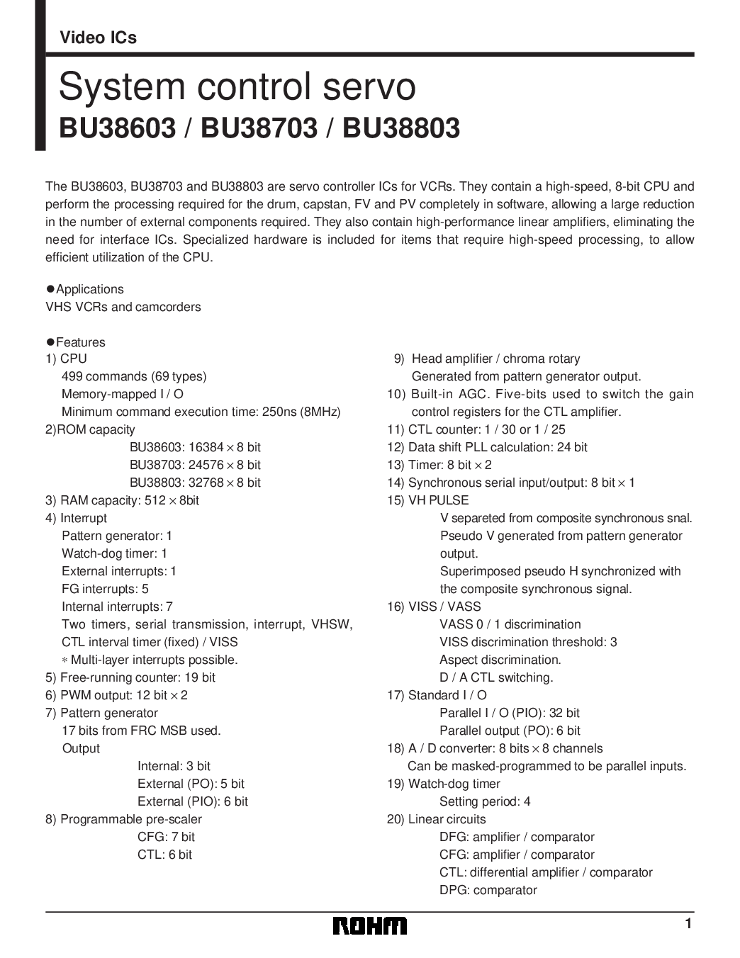 这 bu38603, bu38703 和 bu38803 是 伺服 控制器 ics 用于 vcrs. 他们 包含 一个 高-速度, 8-有点 cpu 和
